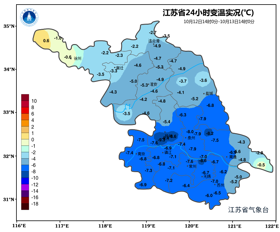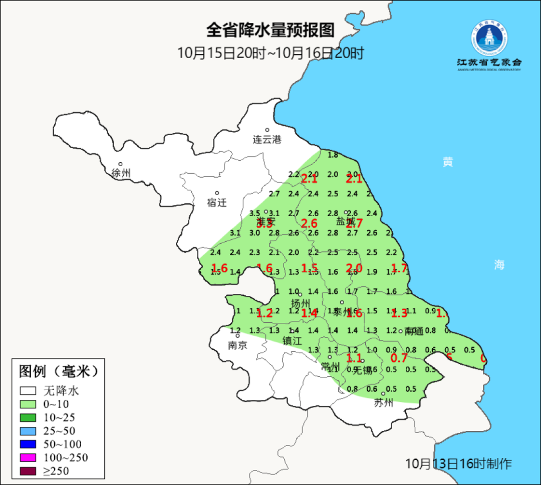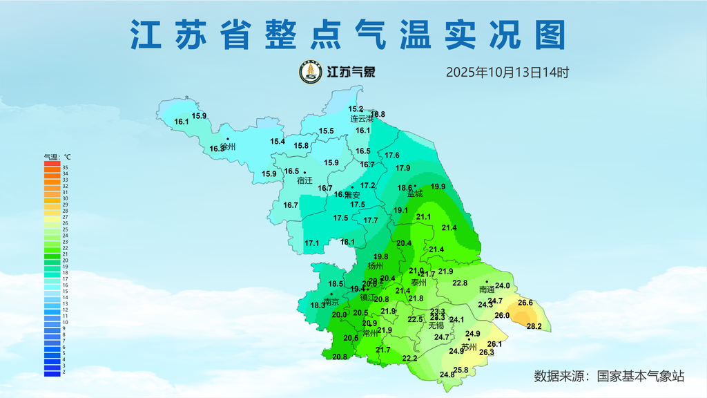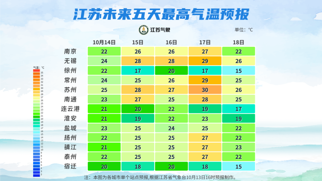 淮河以南地区阴有分散性阵雨并渐止,其他地区多云到阴。最高温度:苏南地区26~27℃,其他地区25℃左右;最低温度:淮北地区16~17℃,其他地区21~22℃。全省偏东风4-5级。