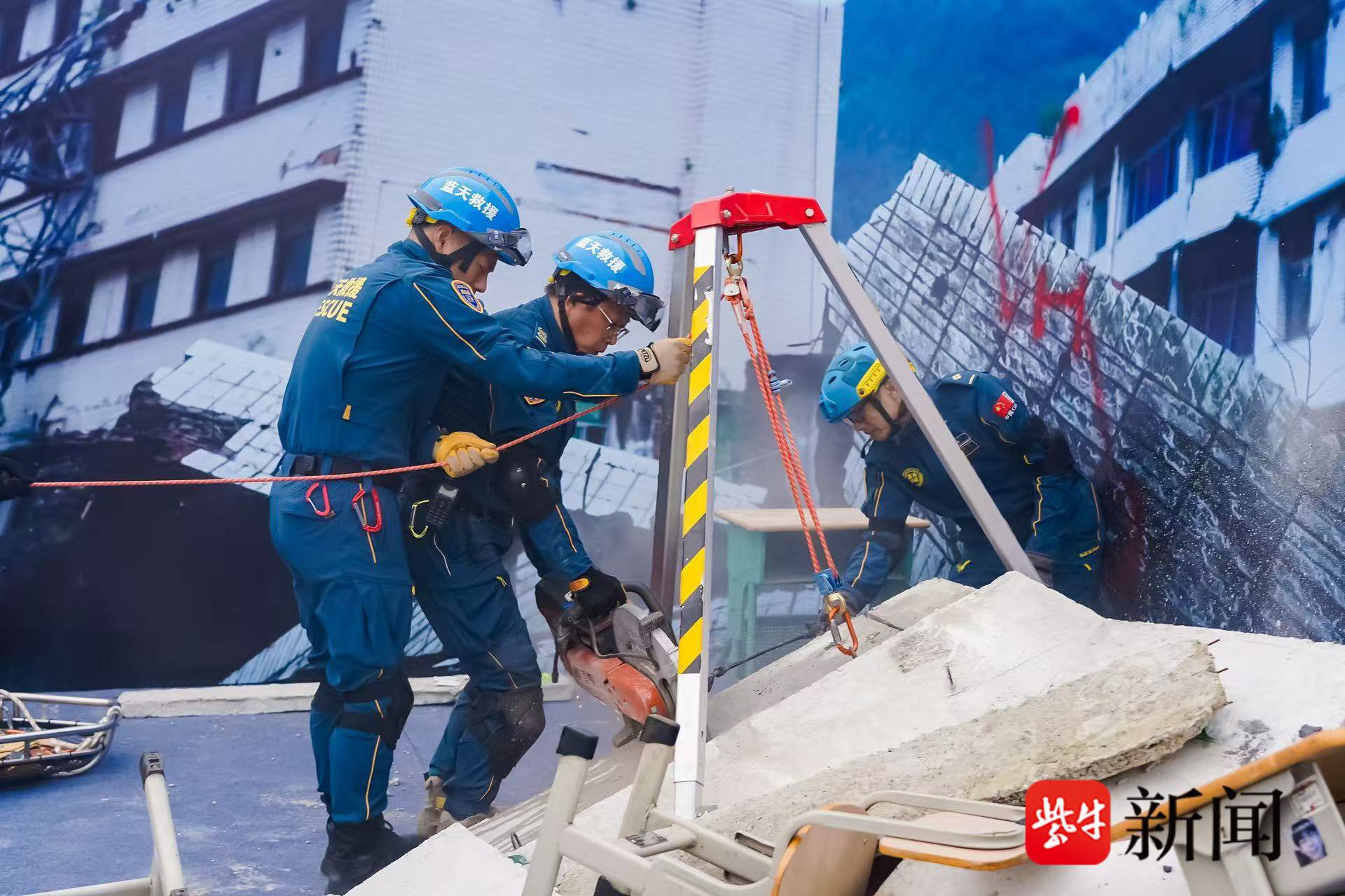 随后,秦淮区消防救援大队、蓝天救援队等专业力量迅速投入“救援”:云梯车精准完成高空救援作业,无人机实时传回现场侦察画面,破拆设备高效打通“生命通道”,机器狗在模拟断路环境中灵活转运应急物资……一系列先进救援装备实战演示,各项科目紧密衔接,展现出南京应急救援处置实力。