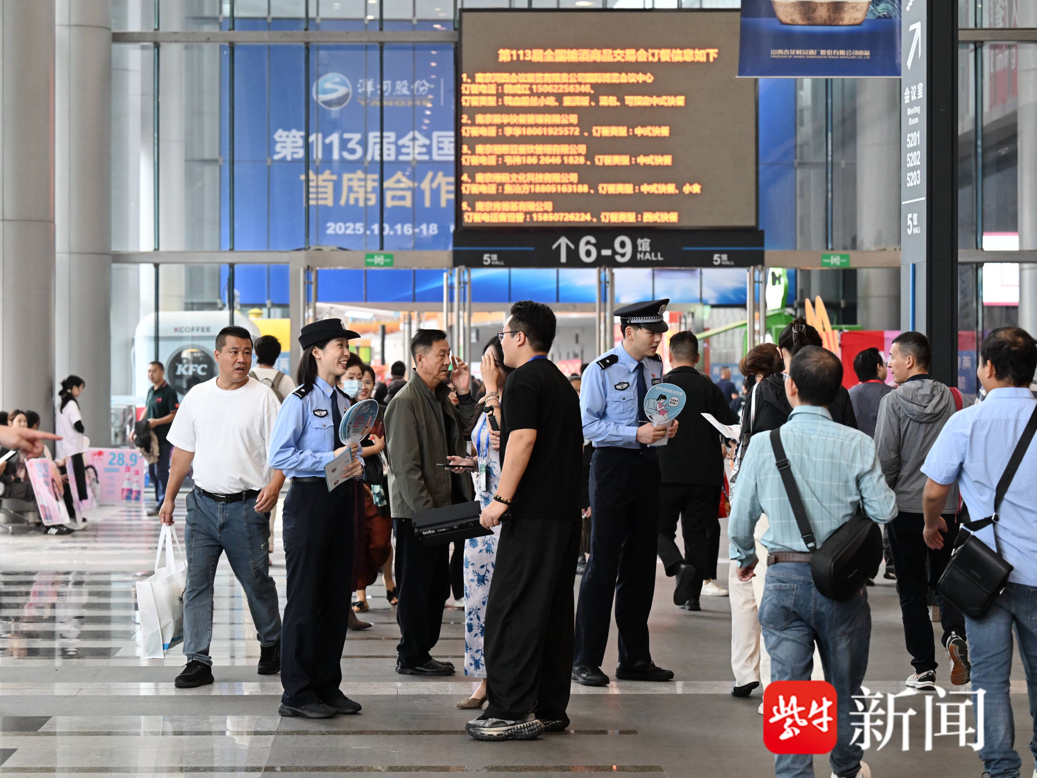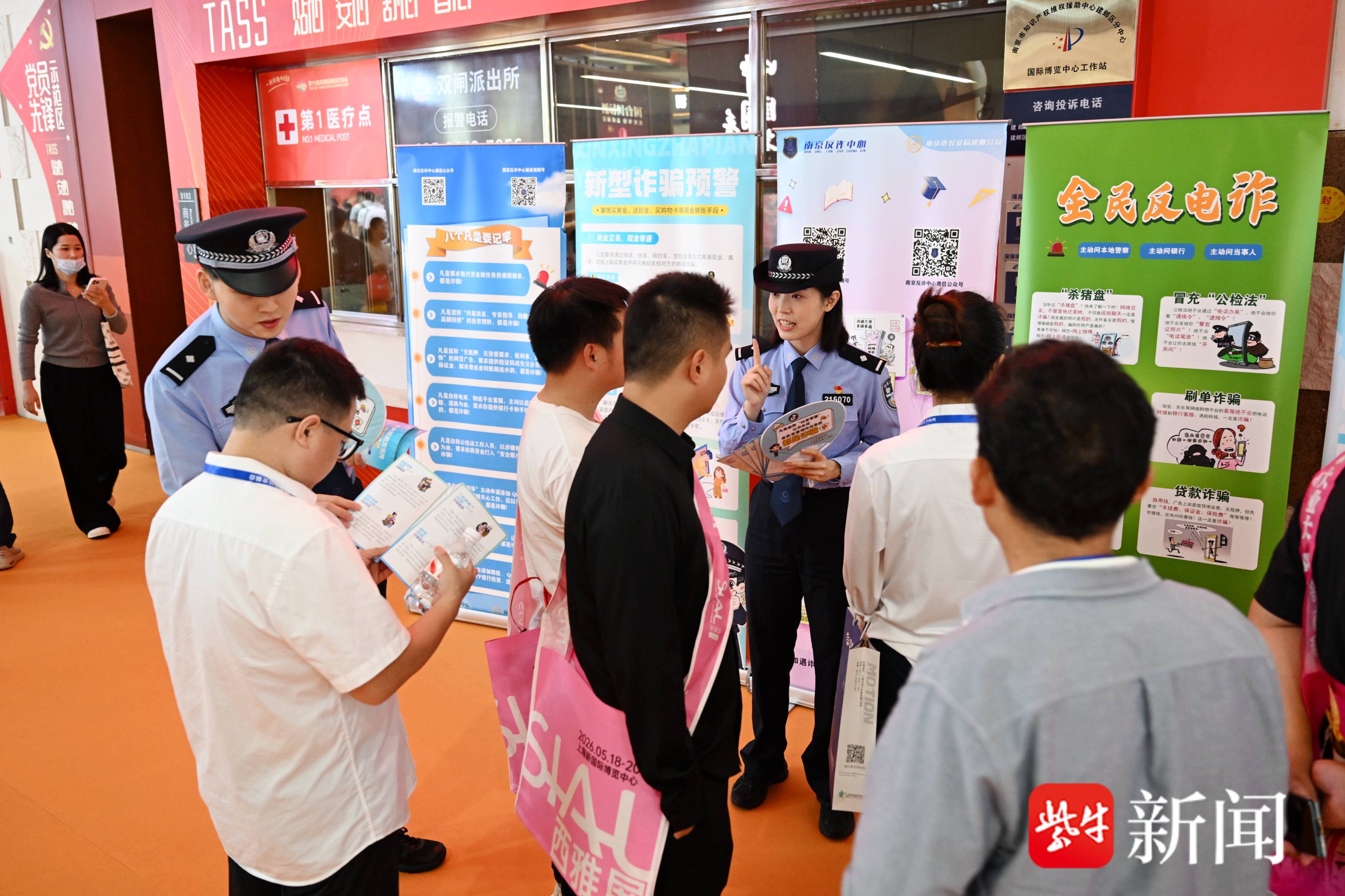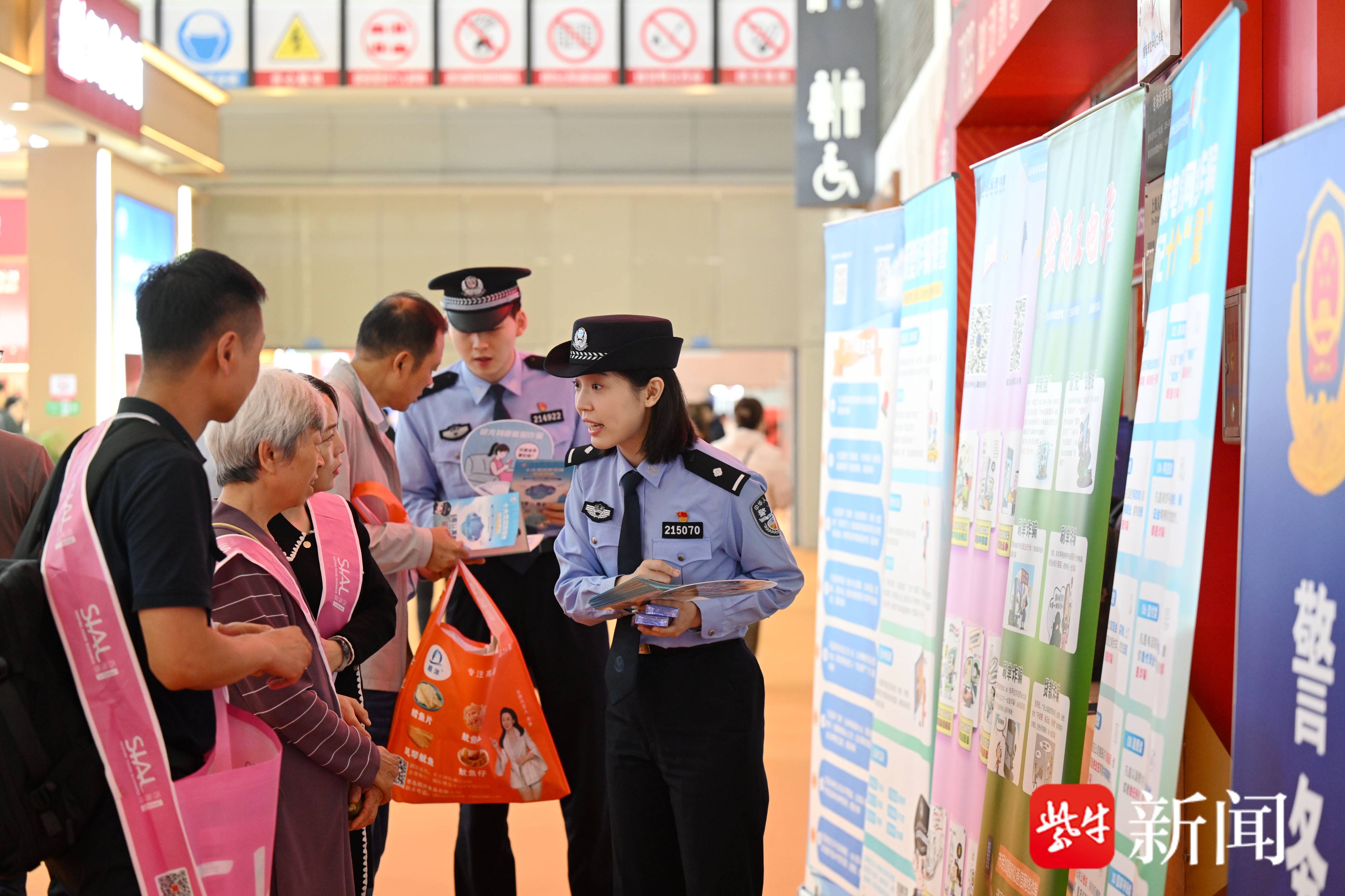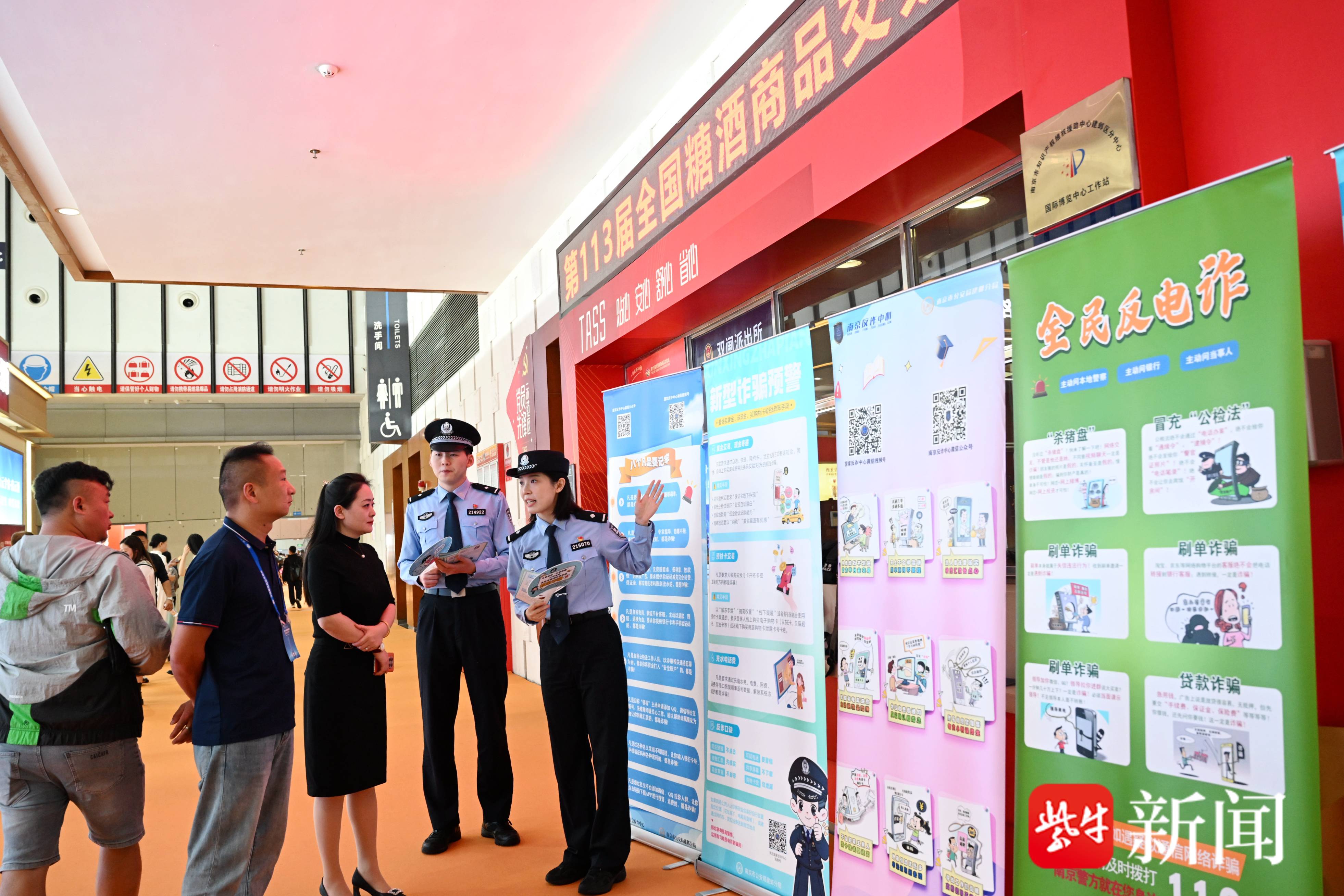 10月16日,第113届全国糖酒商品交易会盛大开幕,南京市公安局建邺分局民警在交易会现场设置反诈宣传点,耐心解答群众疑问,现场传授实用反诈技巧,并为入场观众提供引导和帮助。