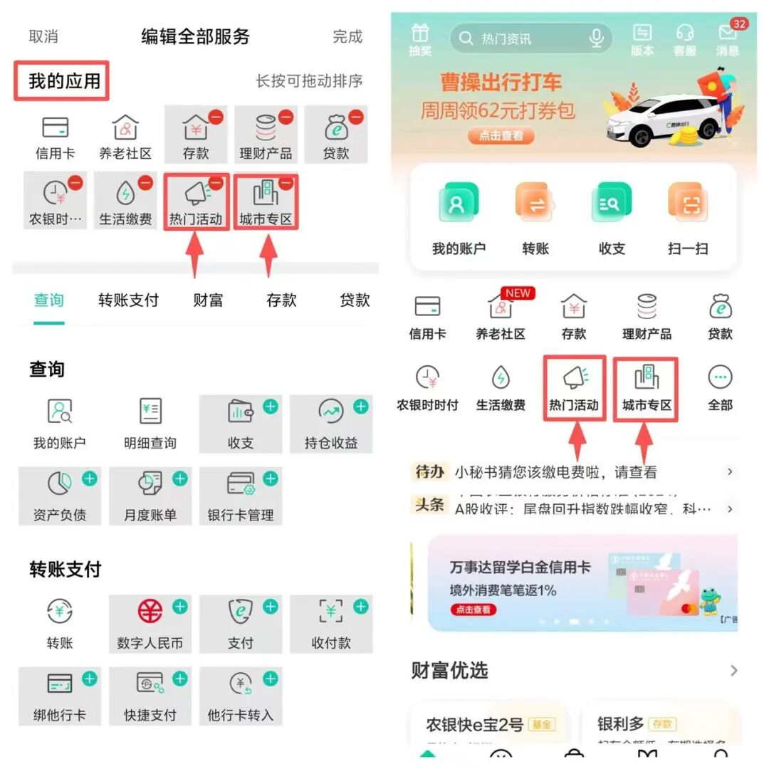 更多活动登录农行掌银“热门活动”“城市专区”查看。