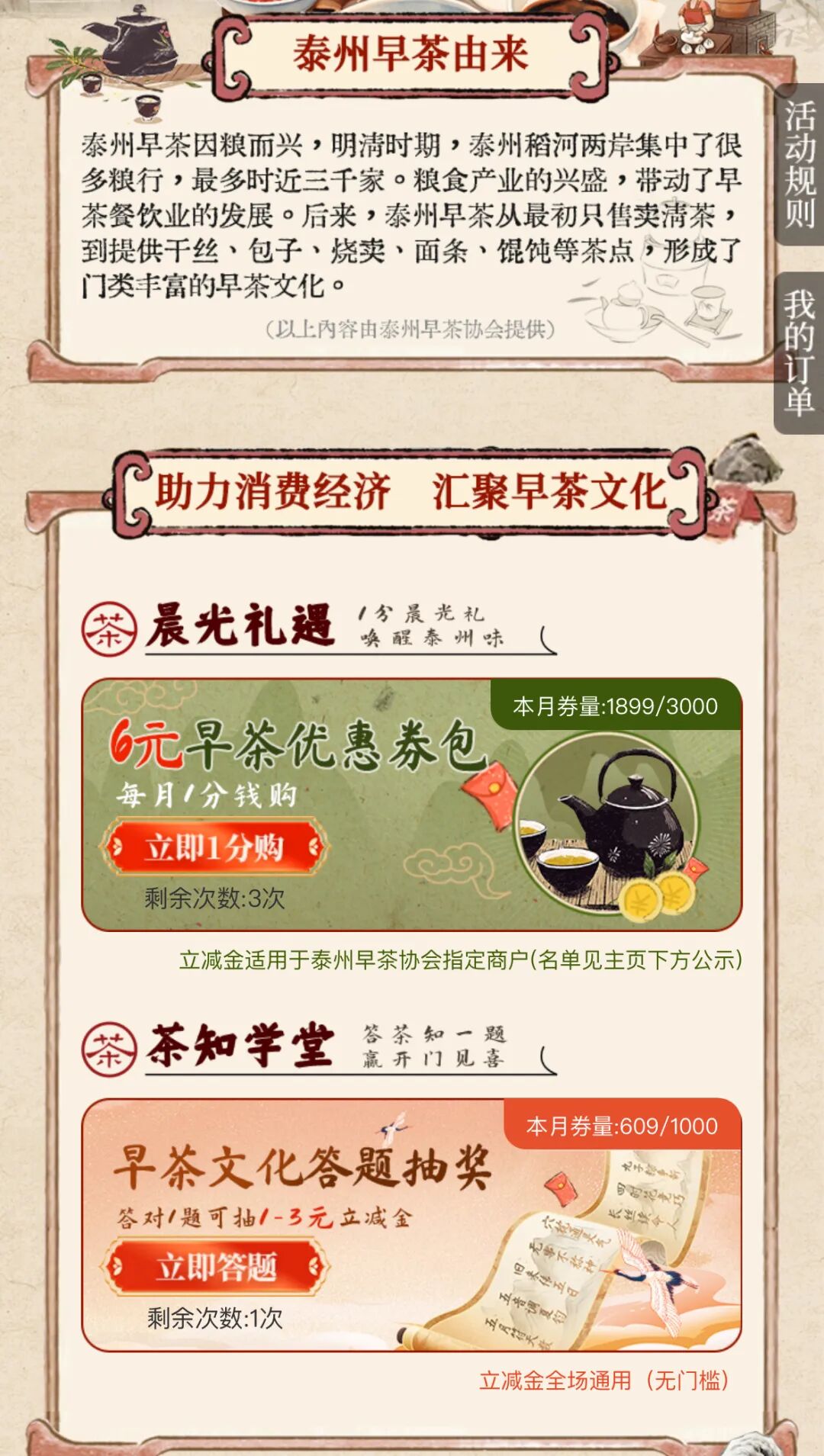 活动内容:助力消费经济,汇聚早茶文化,用户每月可享18元早茶微信优惠券(每支付1分钱可领取6元优惠券,每月可享3次),每日限量300份(周末限量500份)。留芳茶社、泰州宾馆、会宾楼、海棠春等老字号茶楼皆可使用。此外,参与早茶文化答题抽奖可获1至3元微信立减金。