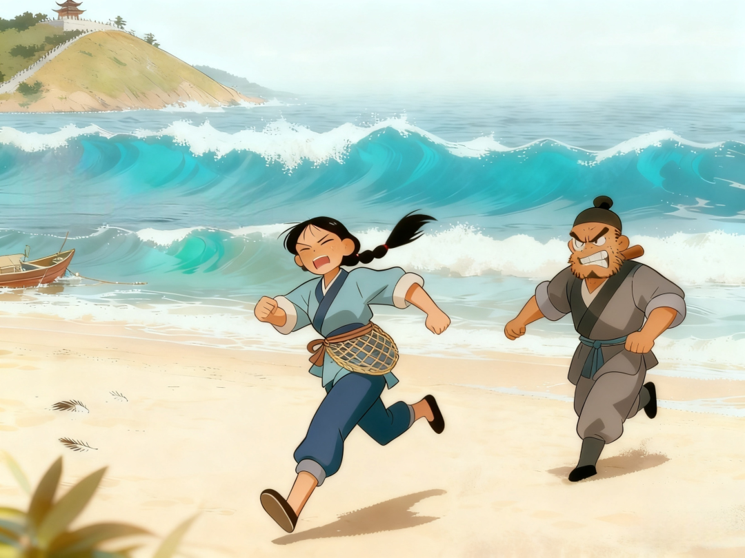 有一天,她正在给大白鸽喂食,听到了追寻而来的金海所吹的笛声,她立即唱起渔歌约定逃离时间。深夜,金海将翠姑救出海州府,却惊动了孙大牙,一群衙役提着灯笼紧追不舍。当金海和翠姑一路爬山越水跑到北固山时,孙大牙和一群随从也逼到山根。金海和翠姑决心死在一起,双双欲跳崖投海。突然,半空中飞来一只白鸽,翅膀一展,“刷”得一下子变得很大很大,落在他俩面前。翠姑一看,正是她喂养的那只大白鸽。于是,她拉着金海跳到大白鸽的背上,大白鸽展翅飞起。