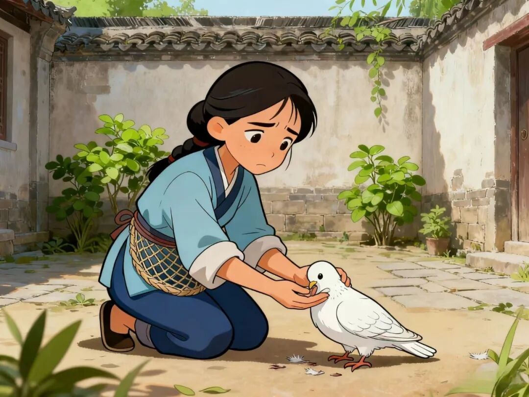 翠姑被抢到海州府后,宁死不从,孙大牙一气之下,把翠姑关在后院,罚她喂养一只受伤的大白鸽。翠姑见大白鸽可怜巴巴的,联想到自己所遭之难,就把大白鸽当做难友,精心喂养。