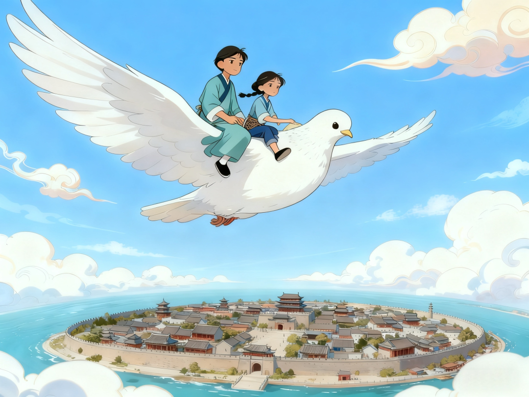 孙大牙一见这情形,忙命随从射箭,大白鸽被乱箭射中多处,它忍痛飞临海上,终因受伤体力不支而扎入海中。孙大牙见人、鸽落入海中,便收兵回府。乡亲们赶紧划船救起金海和翠姑,而那只大白鸽却一动不动地漂在海上,一阵狂风吹过,它化为一座小岛,后人便称此岛为鸽岛。