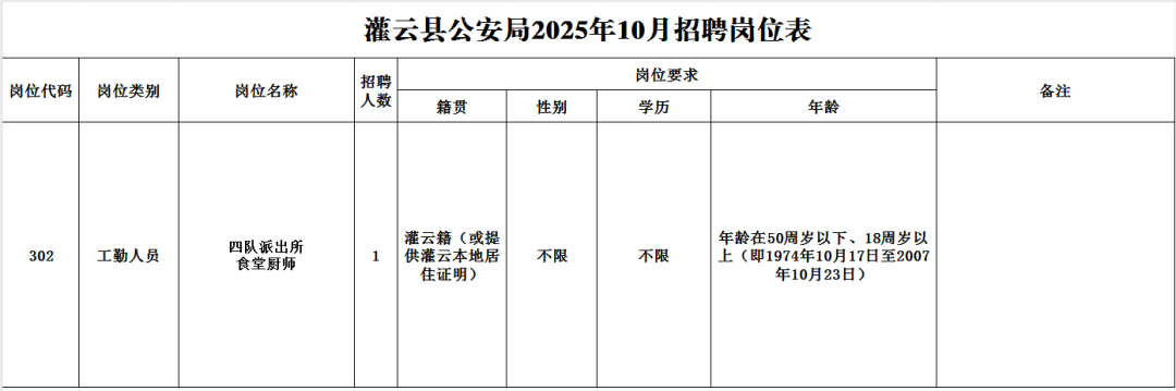 因工作需要,根据《江苏省公安机关警务辅助人员管理条例》《灌云县公安机关警务辅助人员管理办法》等相关规定,现制定招聘简章,面向社会公开招聘1名工勤人员: