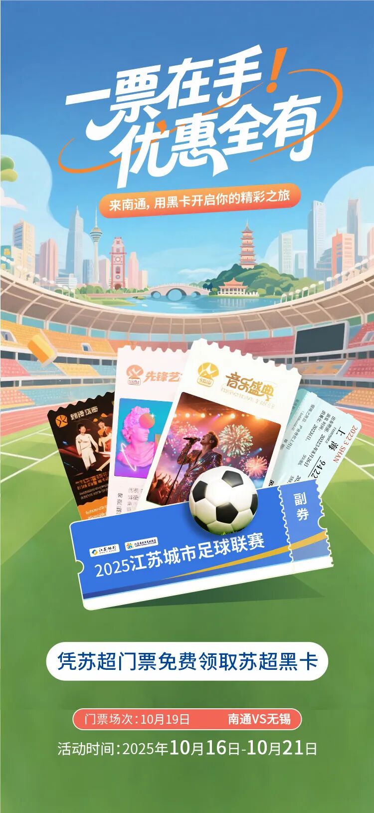 即日起,凭10月19日南通VS无锡“苏超”球赛门票,即可通过“南通票根优惠”小程序线上兑换百余家本地商户为您准备的超值优惠,覆盖餐饮、商超、住宿等多重消费场景,让您的观赛之旅省心、省力更省钱。