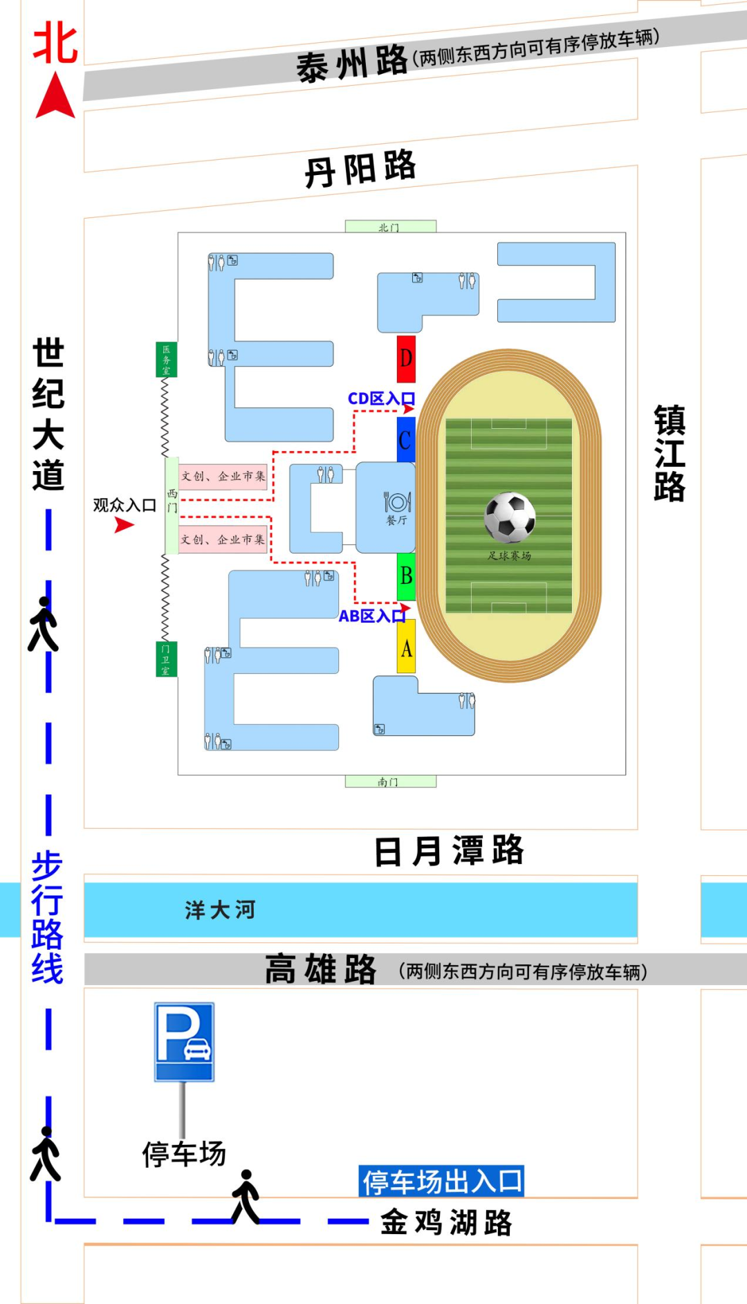 主队、裁判及工作人员入口:学校北门(丹阳路)。
