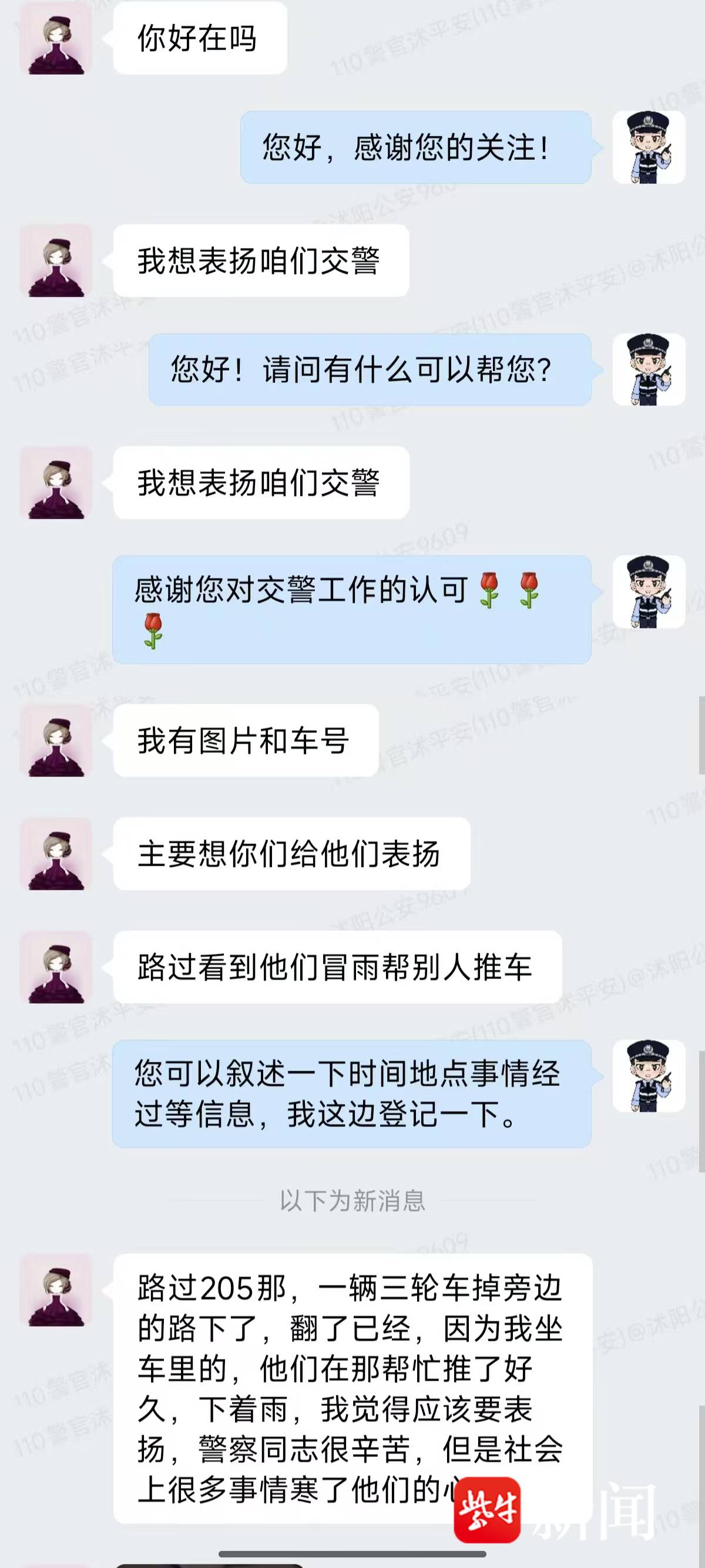 扬子晚报网10月18日讯(通讯员 毛雯雯 记者 陈勇)“想投稿表扬咱们大沭阳交警!” 近日,江苏沭阳公安“蓝朋友”——110 虚拟警官 “沭平安”,与沭阳公安抖音号同步收到了一份满是暖意的私信。热心网友不仅在私信里表达了对交警的认可与点赞,还特意分享了一段交警冒雨救助的现场画面。