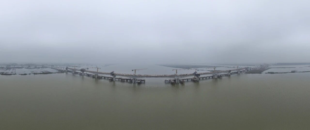 宁淮城际铁路洪泽至金湖双线特大桥跨淮河入江水道段位于淮安市金湖县境内,施工区域河面宽约2420米,地处Ⅲ级航道与Ⅱ级水源保护地;采用8座连续梁+多跨简支箱梁的组合形式的施工工艺,是宁淮城际铁路全线跨水域最广、跨度最长的连续梁桥群。项目团队严格推行精细化管理模式,强化全流程风险管控与质量把控,通过闭环管理确保连续梁合龙精度与线形控制全面达标。