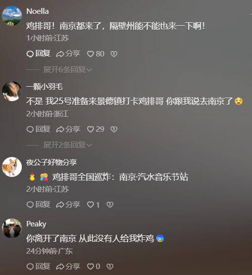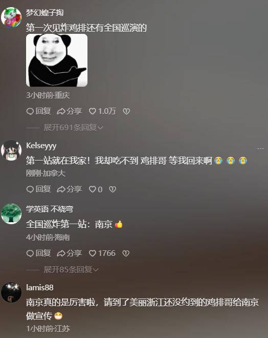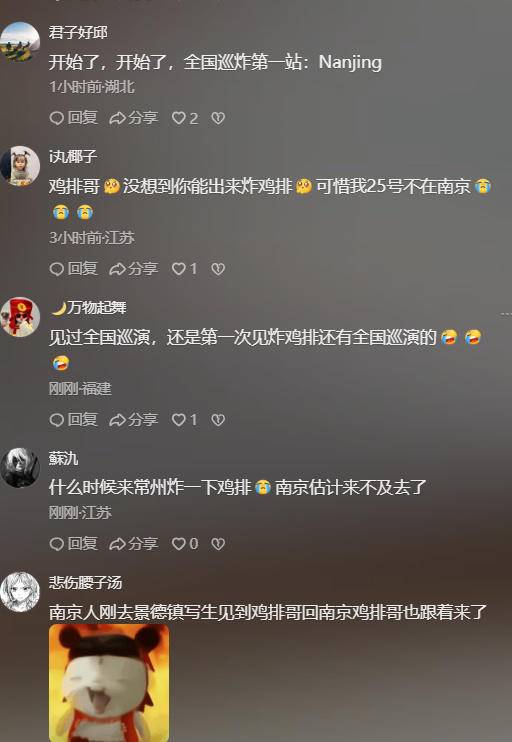 网友们纷纷涌入评论区表达期待:“终于等到鸡排哥!”“南京人民已就位,就等开炸!”“第一次见炸鸡排还有‘全国巡炸’的!”