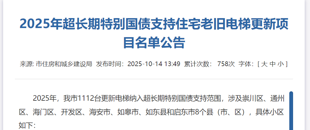 近日,南通市住建局发布《2025年超长期特别国债支持住宅老旧电梯更新项目名单公告》,明确将对南通市81个小区的老旧电梯进行更新,总共涉及1112台电梯。