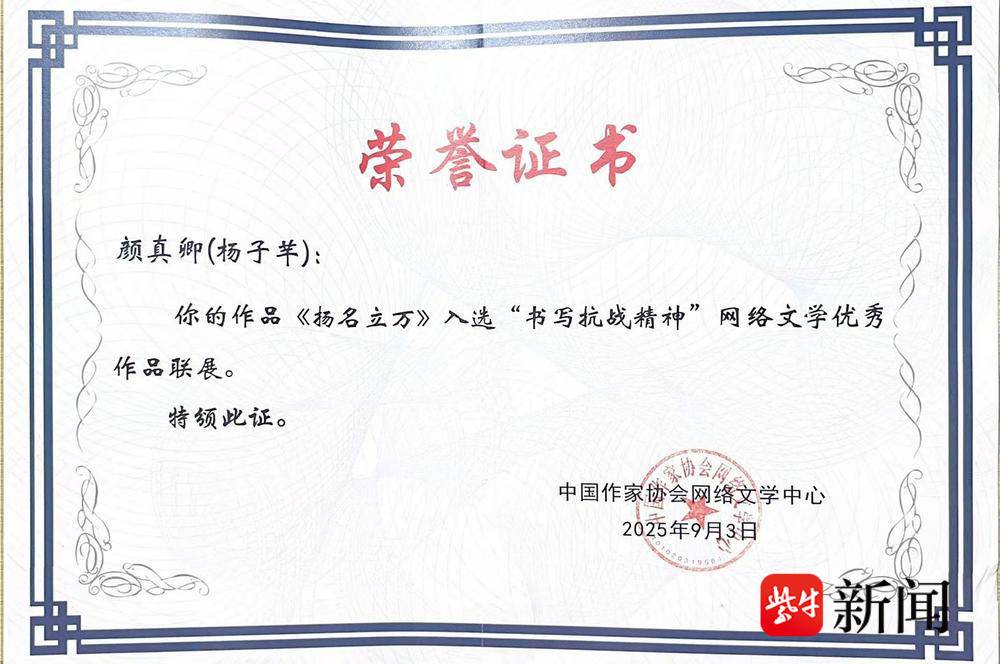 近日,盐城幼儿师范高等专科学校小教22级本科班学生杨子芊(笔名颜真卿)收到中国作家协会网络文学中心颁发的荣誉证书,其作品《扬名立万》入选“书写抗战精神”网络文学优秀作品联展。