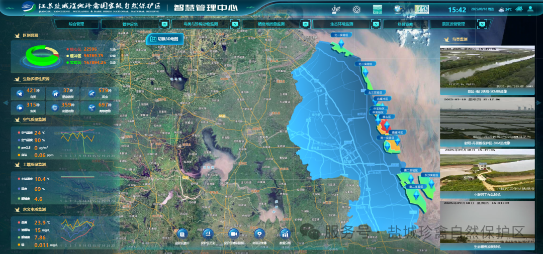 盐城珍禽保护区是生物多样性富集的滨海湿地,素来享有东部沿海“国家重要湿地基因库”之称。去年5月,盐城珍禽保护区完成“一中心、七系统”的智慧管理平台建设,实现对保护区生态资源的全面感知、智能分析和精准管理,为珍禽等野生动植物的繁衍栖息保护、科研监测、科普宣传等提供更加坚实的保障。