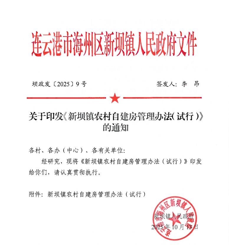 近日,连云港市海州区首个农村自建房专项管理文件 ——《新坝镇农村自建房管理办法(试行)》正式实施。该办法以清晰审批流程、明确办理时限和全链条监管机制,不仅为村民圆“安居梦”扫清障碍,更与全区农村C/D级危房整治、农房改善工作形成联动,标志着海州区在规范农村建房、保障住房安全、推进乡村治理现代化方面迈出关键一步。