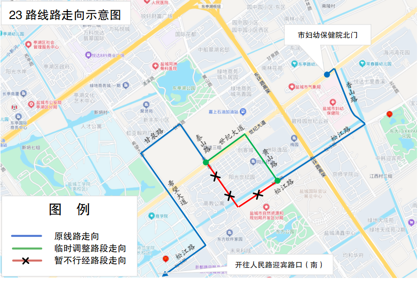 因松江路与泰山路交叉口道路封闭施工,2025年10月20日起,公交23路临时改道行驶,具体如下: