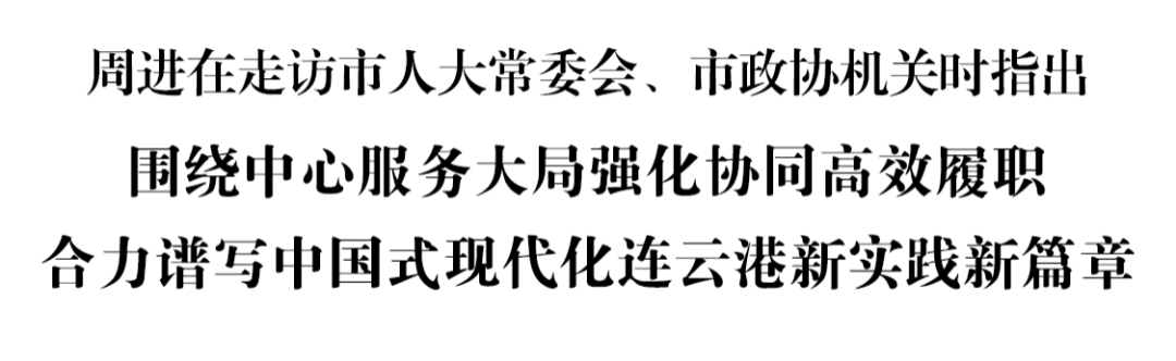 周进表示,连云港市政府将在连云港市委坚强领导下,一如既往支持人大、政协工作,自觉接受连云港市人大常委会法律监督、工作监督和市政协民主监督,以钉钉子的精神和真抓实干的作风,推动经济持续回升向好,努力争取更好结果。希望连云港市人大常委会、市政协领导同志持续关心、支持、监督政府工作,为加快实现高质量发展“后发先至”携手努力、作出新的更大贡献。