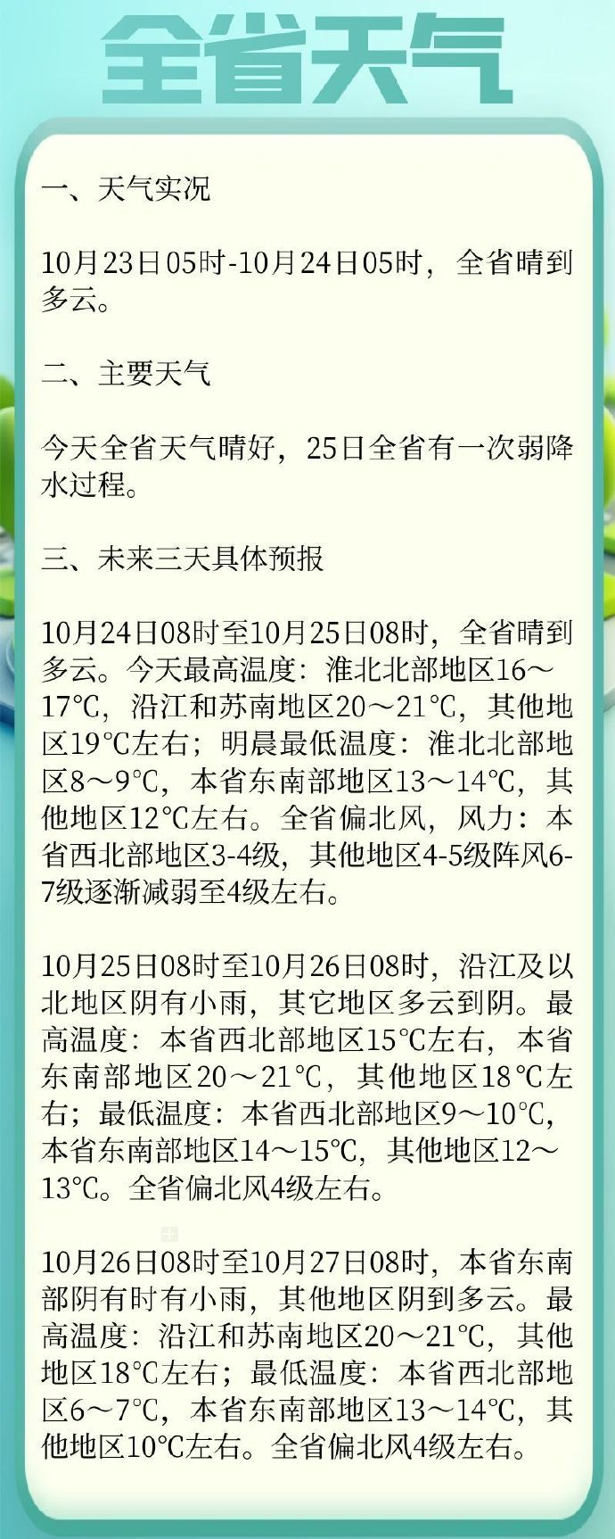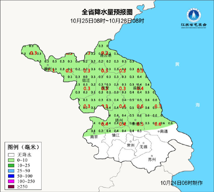 10月24日08时至10月25日08时,全省晴到多云。今天最高温度:淮北北部地区16~17℃,沿江和苏南地区20~21℃,其他地区19℃左右;明晨最低温度:淮北北部地区8~9℃,本省东南部地区13~14℃,其他地区12℃左右。