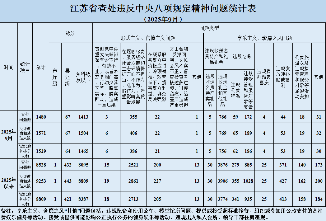 2025年9月,全省共查处违反中央八项规定精神问题1480起,批评教育和处理1571人、其中给予党纪政务处分1529人。从问题类型看,查处形式主义、官僚主义问题381起、批评教育和处理435人,查处享乐主义、奢靡之风问题1099起、批评教育和处理1136人。从人员级别看,批评教育和处理县处级干部67人、乡科级及以下人员1504人。