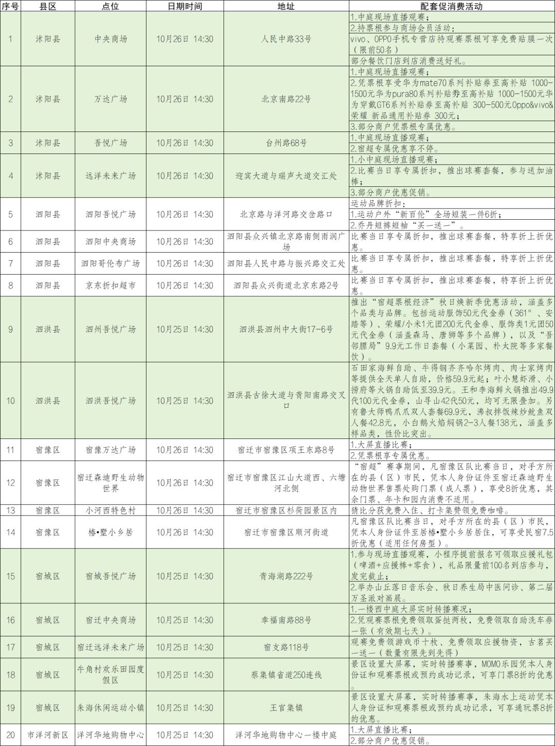 本次活动以“宿超”任意一场观赛票根为核心载体,推出多维度消费激励政策。在沭阳县万达广场,凭票根可享受华为、OPPO、vivo等品牌新品补贴,最高优惠达1500元;泗阳县吾悦广场推出运动品牌“买一送一”、短装6折等折扣;泗洪县吾悦广场则联合餐饮商户推出59.9元起单人自助、代金券无限叠加等优惠。此外,宿城区中央商场提供免费蛋挞、洗车券等实用福利,市洋河新区华地购物中心也推出商户专属促销。