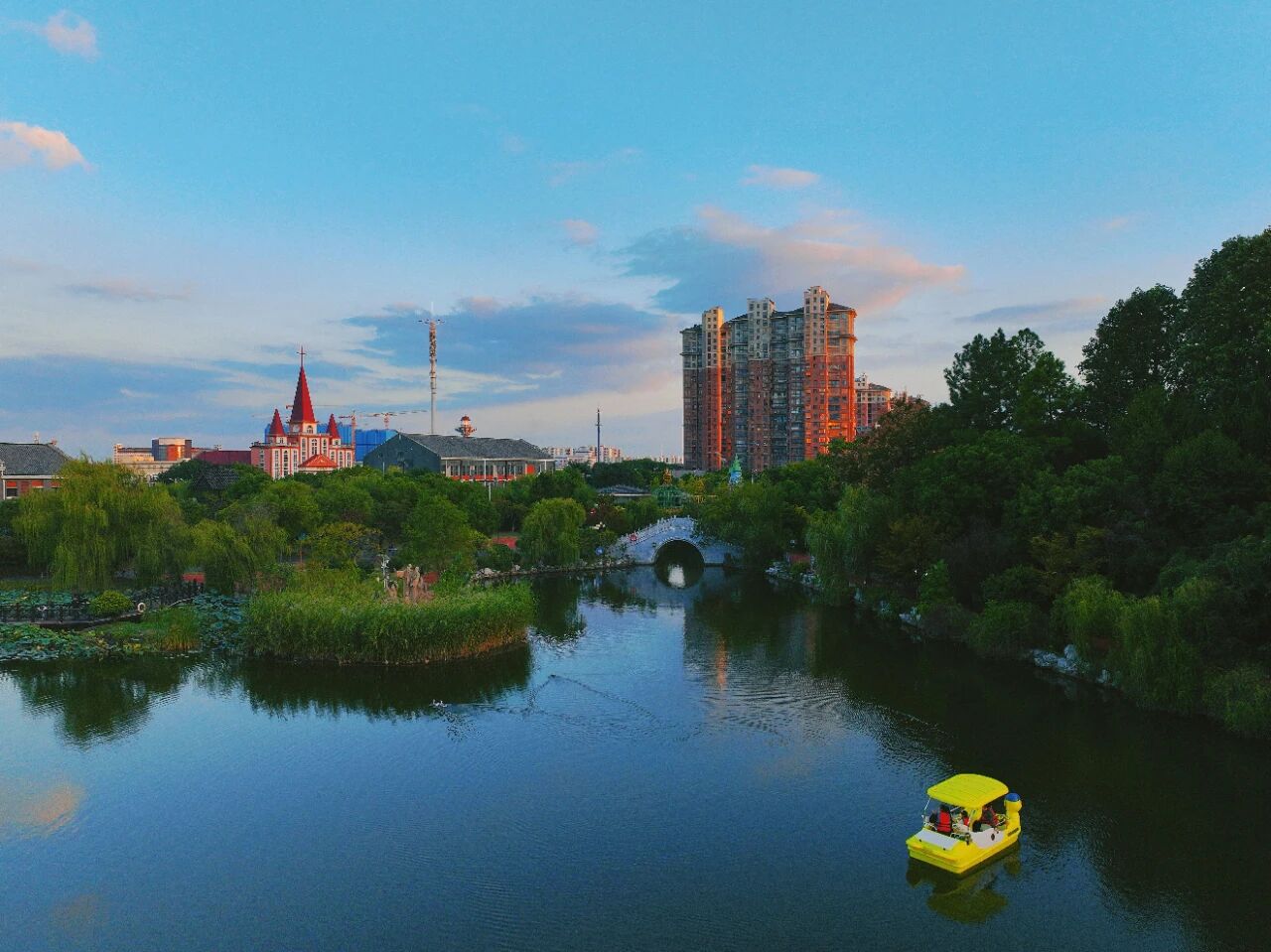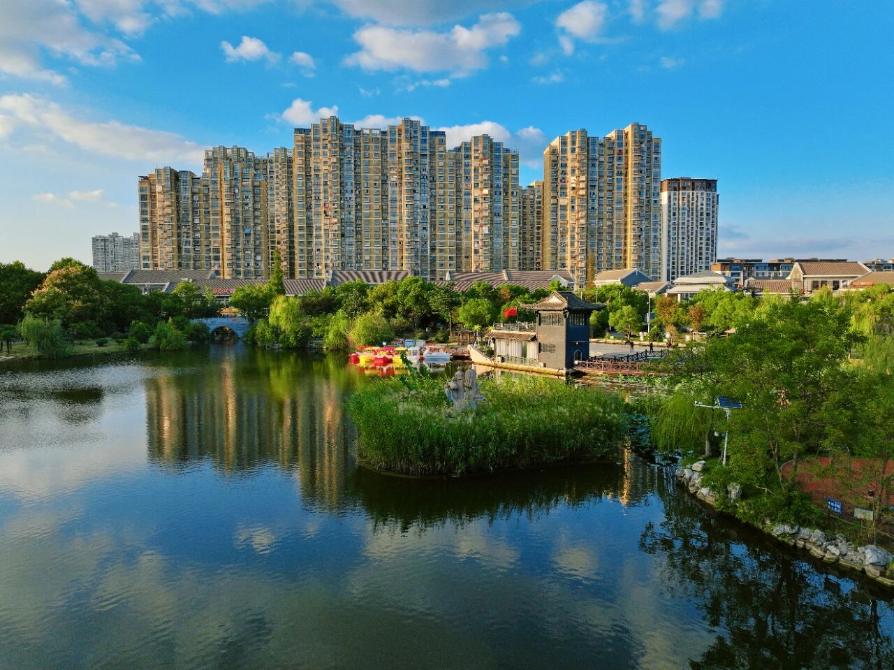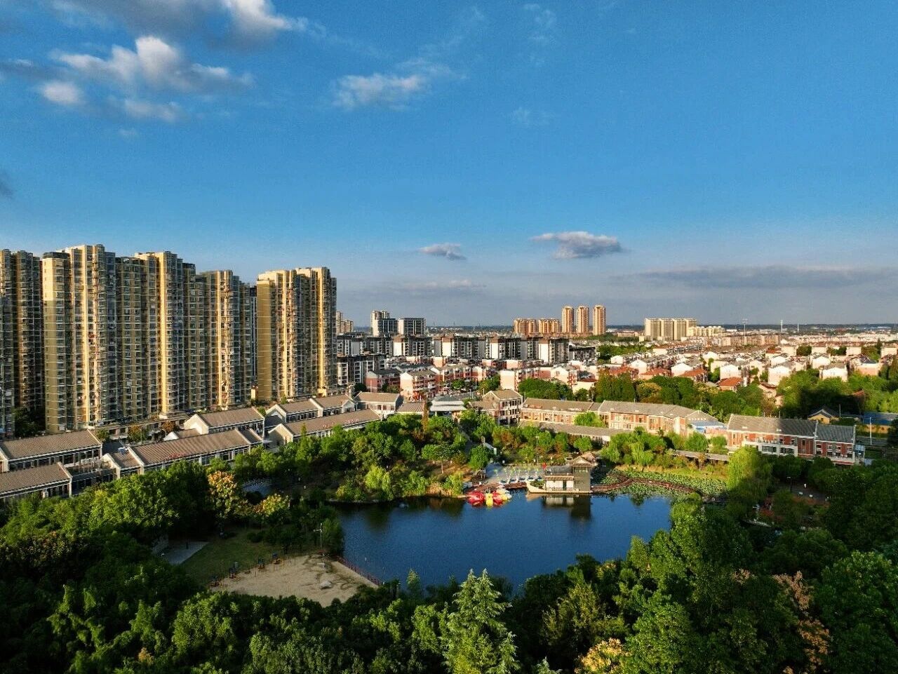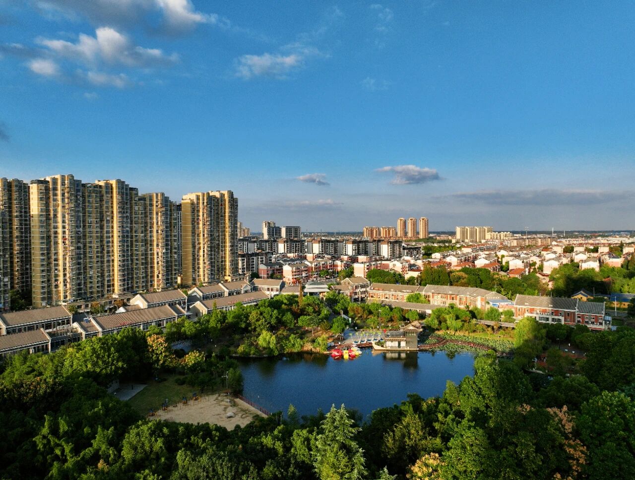 午后晴空延展至落日霞光,航拍镜头下的人民公园,铺展成一幅定格民生幸福的城市画卷。环湖步道青年竞奔展活力,健身区市民闲谈享悠然,游乐区童声悦耳,湖面彩船漾波,水鸭与游人相映成趣。