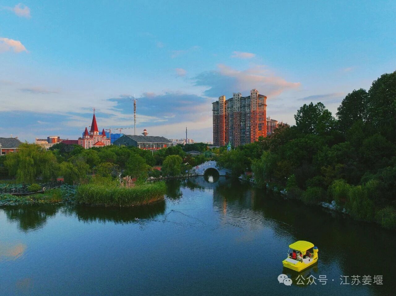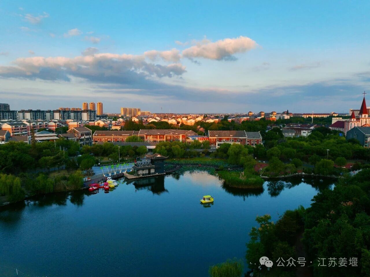 金辉漫染间,天地融于橘粉霞光,公园的宁静诗意,正是姜堰以民生为笔、以宜居为墨,绘就的幸福城市生动注脚。