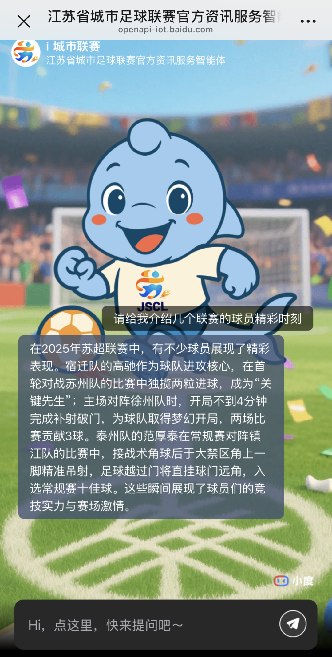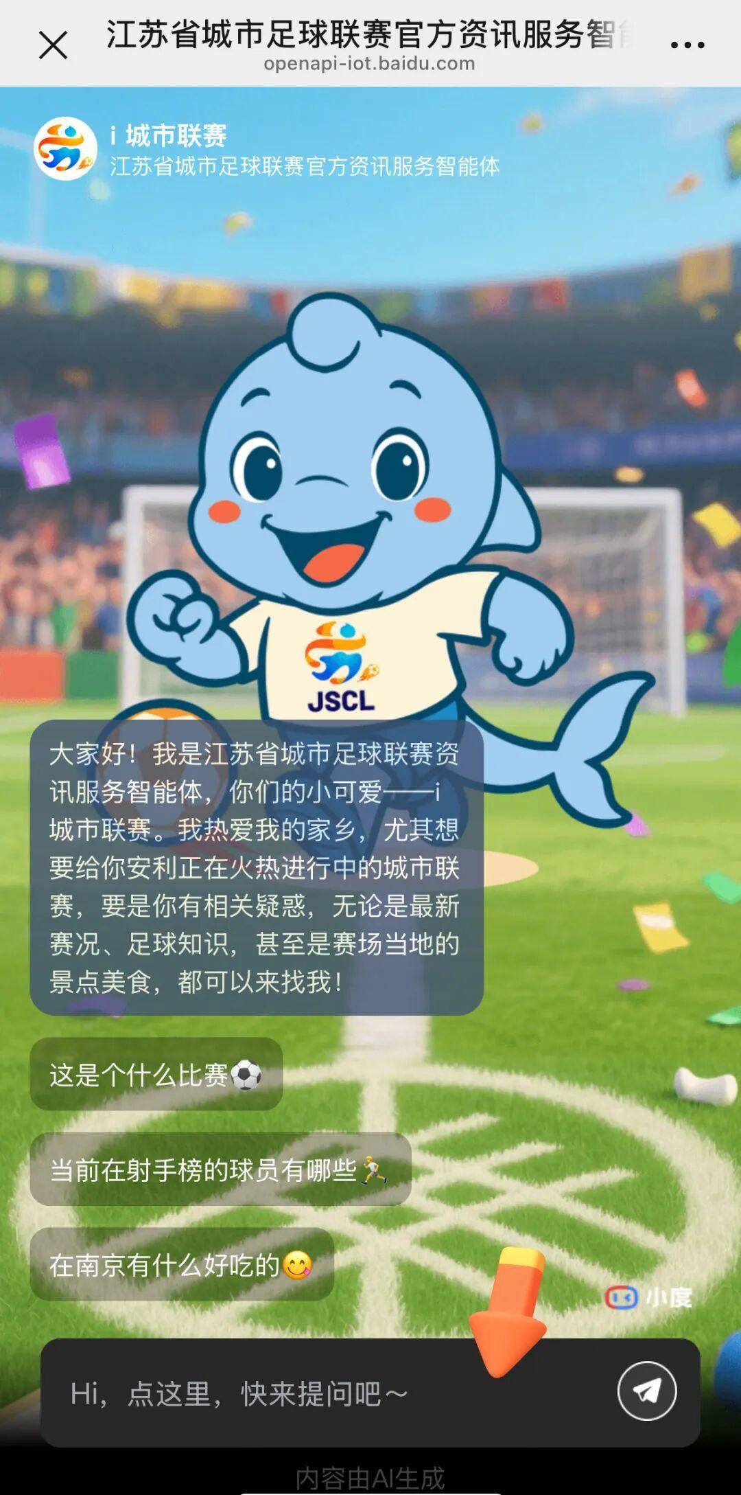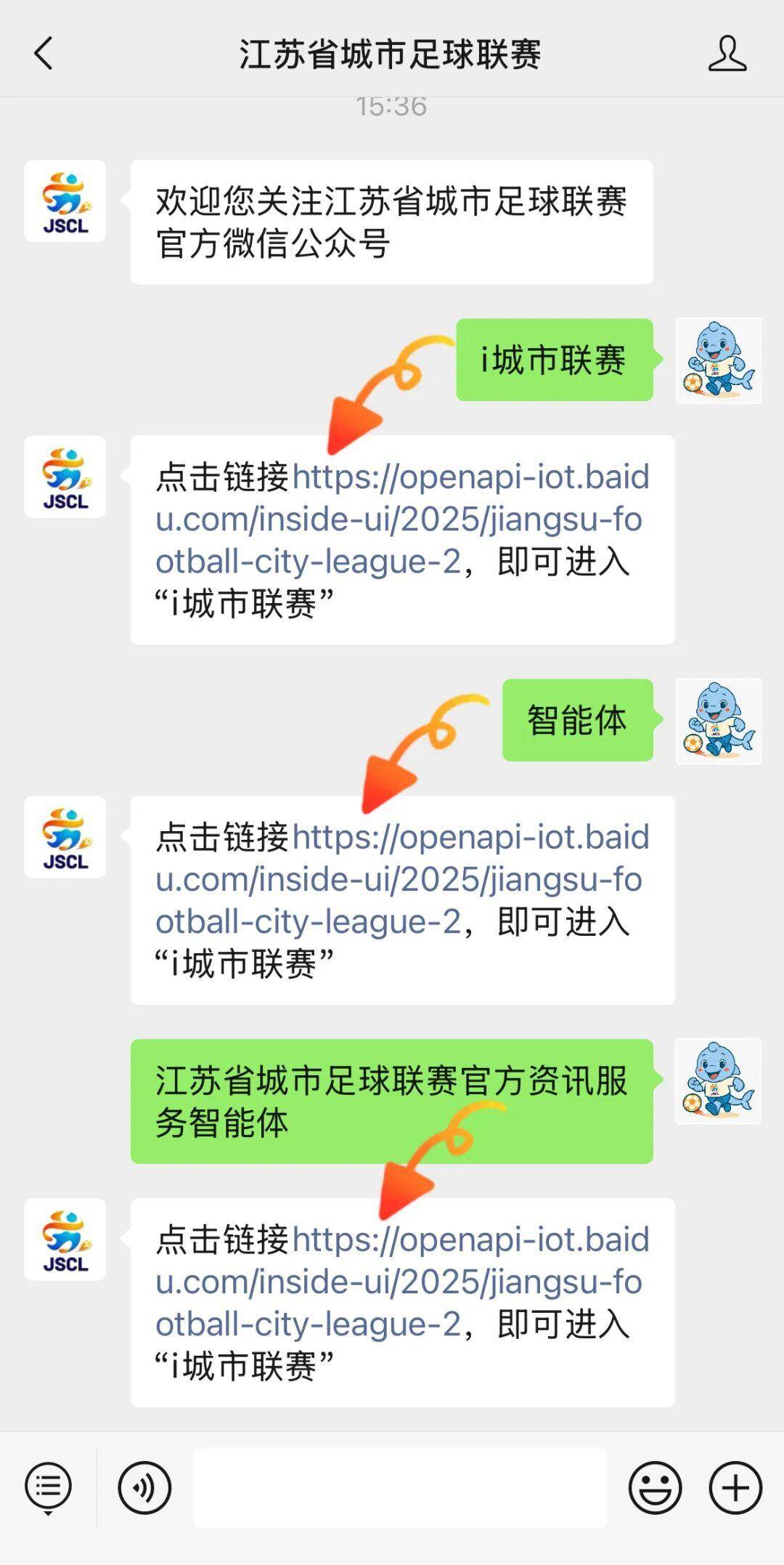 3.编辑“i城市联赛”“智能体”或“江苏省城市足球联赛官方资讯服务智能体”的文字并发送,即可获取“i城市联赛”网址链接。