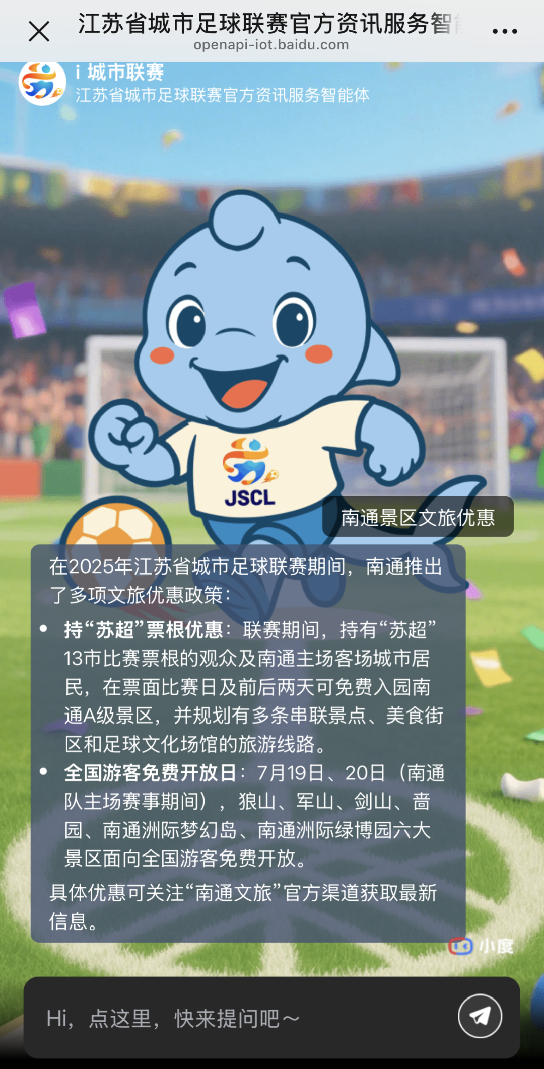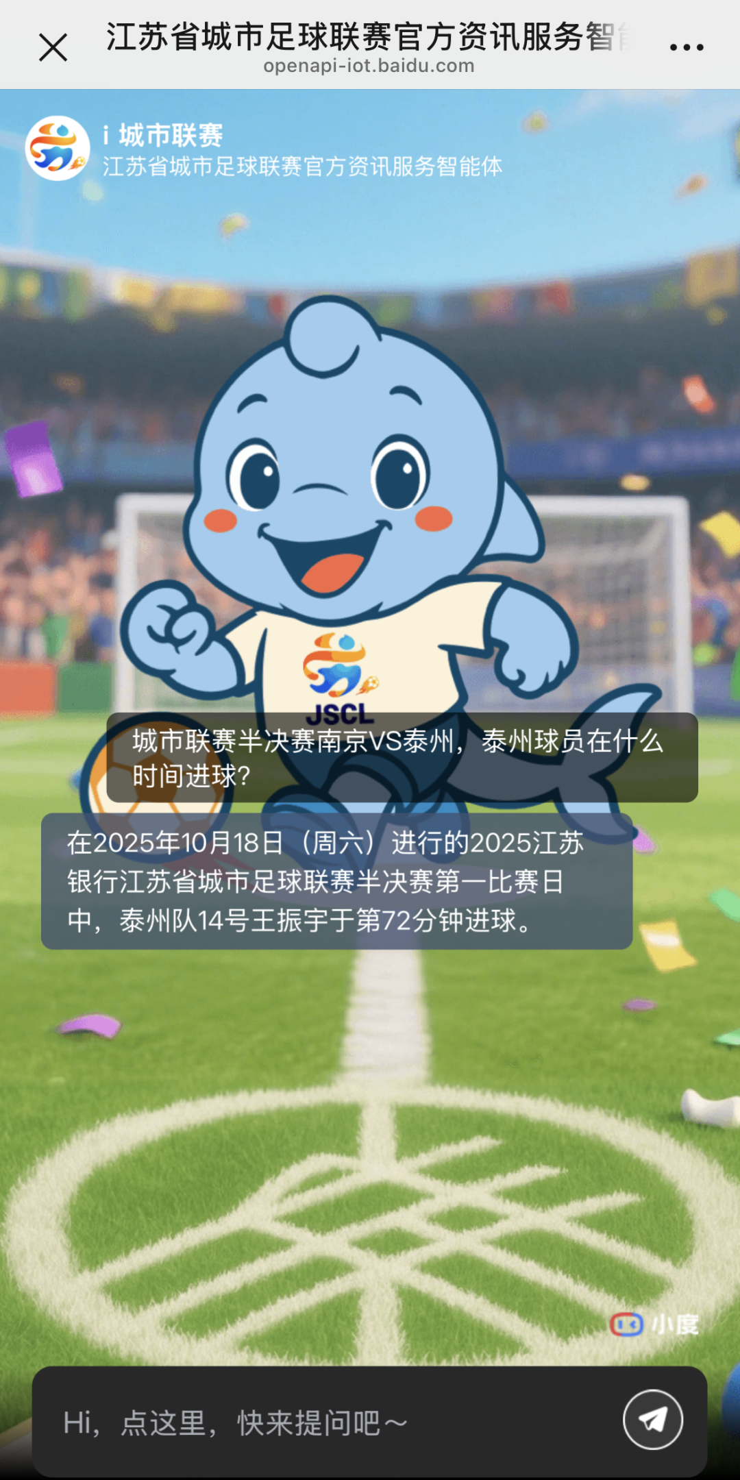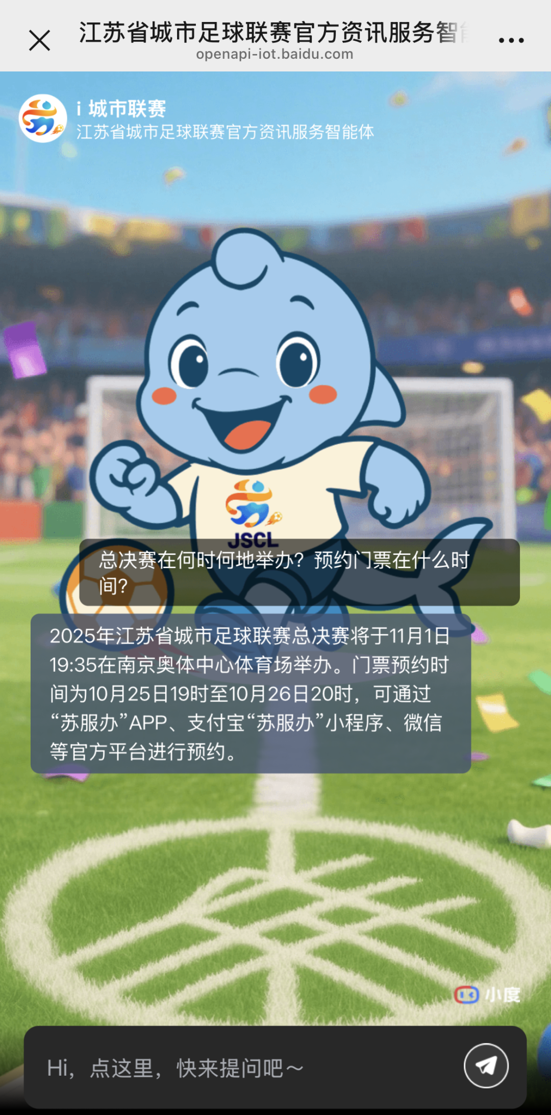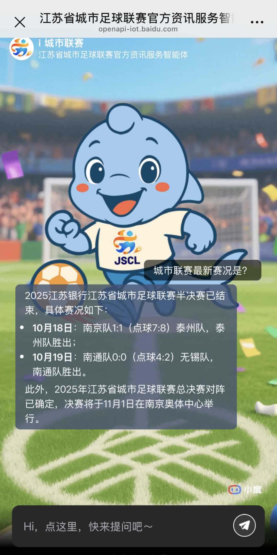 3.编辑“i城市联赛”“智能体”或“江苏省城市足球联赛官方资讯服务智能体”的文字并发送,即可获取“i城市联赛”网址链接。