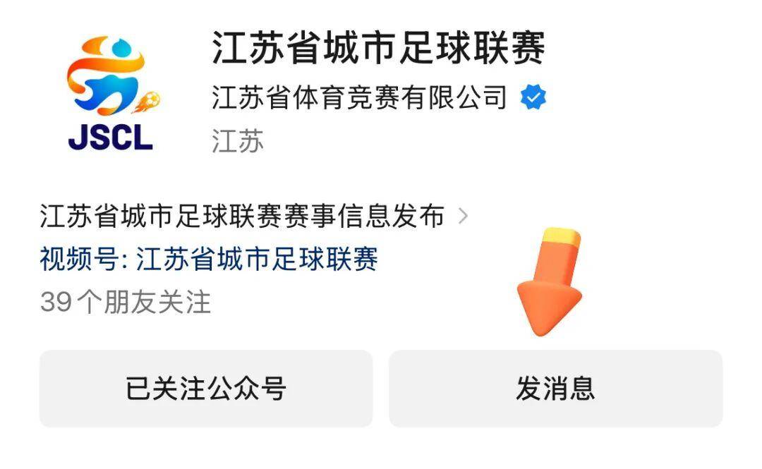 1.打开“江苏省城市足球联赛”公众号,点击“发消息”,进入公众号页面。