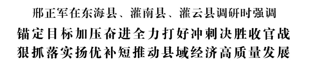 10月21日、23日和24日,连云港市委书记邢正军先后到东海县、灌南县、灌云县调研。他强调,要深入学习贯彻习近平总书记关于做好经济工作的重要指示和对江苏、对连云港工作重要讲话重要指示精神,干字当头、狠抓落实,扬优展长、补短强弱,全力以赴冲刺年度目标任务,加快推动县域经济高质量发展,以实干实绩为全市大局作出更大贡献。连云港市领导吴冈玉、李莉等参加。