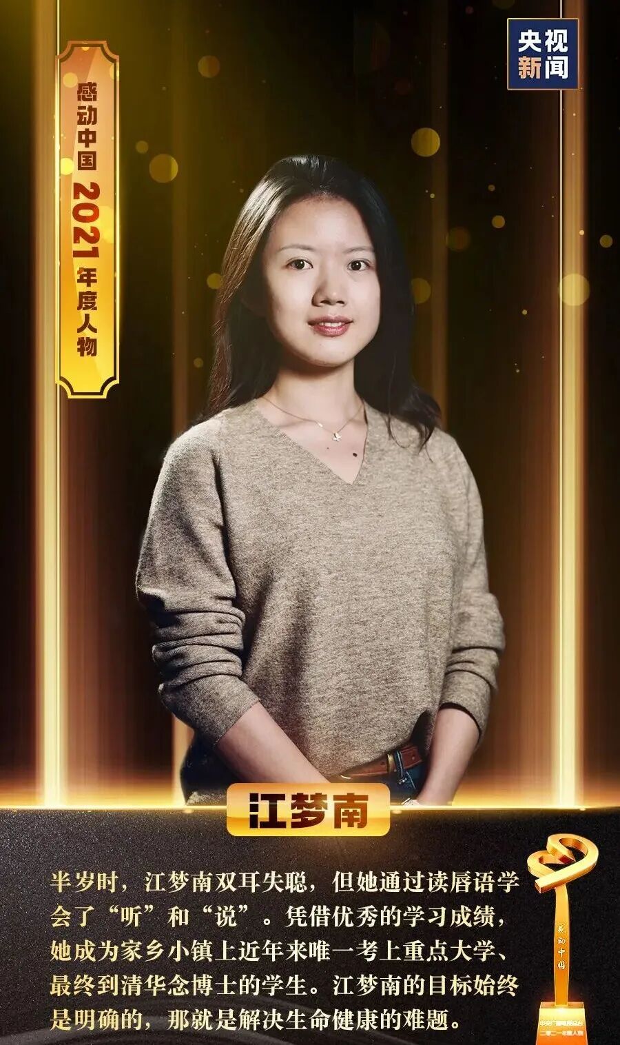 读博期间,江梦南被评为“感动中国2021年度人物”。《感动中国》为她写下颁奖辞:从无声里突围,你心中有嘹亮的号角。