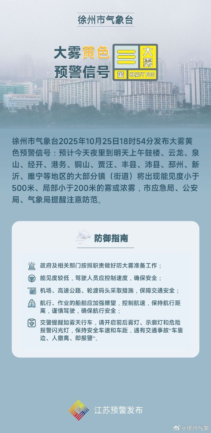 预计今天夜里到明天上午鼓楼、云龙、泉山、经开、港务、铜山、贾汪、丰县、沛县、邳州、新沂、睢宁等地区的大部分镇(街道)将出现能见度小于500米、局部小于200米的雾或浓雾,市应急局、公安局、气象局提醒注意防范。