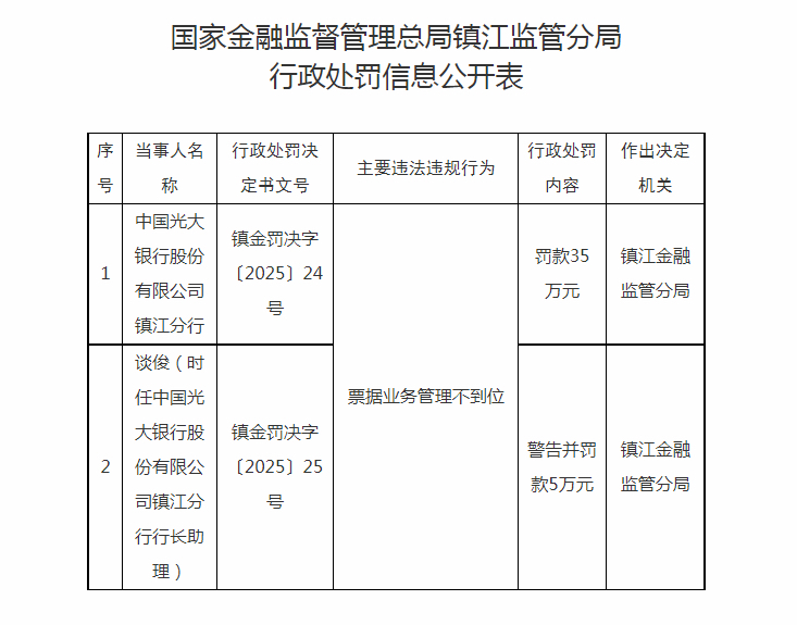 其中,镇金罚决字〔2025〕24号、中国光大银行股份有限公司镇江分行被罚款35万元;镇金罚决字〔2025〕25号 、谈俊(时任中国光大银行股份有限公司镇江分行行长助理)被“警告并罚款5万元”。