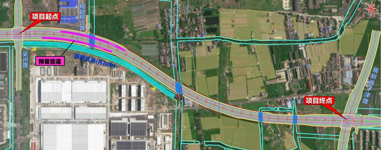 运河南路南延工程(吴州路—扬子津路),起自吴州路,终点为扬子津路,沿线与规划横六路平交,路线全长1862米,道路等级为城市主干路,红线宽57到70米,设计速度50公里/小时。路面采用双向六车道断面标准,与起终点吴州路和扬子津路交叉口平交,沿线与规划横六路平交,均采用信号灯控制。道路标准段横断面宽57米,具体布置为:中间8米中分带,两侧11.5米机动车道、2.5米侧分带、4.5米非机动车道、3米人行道、3米边化带。工程建成后,将加强中心城区南北向城市组团联系,支撑城市空间结构向南扩展,形成以城市快速路为骨架、城市主干路为支撑的城市快捷高效道路网络,推进城市市政基础设施智能化建设与改造,进一步提高市政基础设施运行效率和安全保障水平。