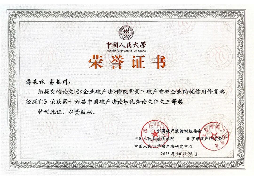 经第三方专家严格评审,蒋森林律师与易长川律师合作的论文最终荣获 “优秀论文征文三等奖”。这一奖项不仅是对江成律所专业能力的肯定,更填补了镇江律师在中国破产法论坛征文获奖史上的空白,为本地律师行业在破产法专业领域的发展树立新标杆。