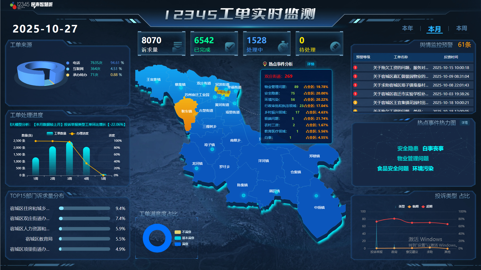 平台构建了以DeepSeek大模型和语音识别算法为核心的技术底座,提供从“智能受理-精准分拨-闭环处置-决策优化”的全链条服务。其核心是通过多源数据融合与AI模型,实现语音实时转写、工单智能分拨、跨部门协同调度及数据可视化监控,形成“接听即录入、录入即分拨”的高效响应闭环。通过数据驱动,宿城区工单处理效率提升80%,平均响应时间从4小时压缩至1小时;智能分拨准确率达93%,跨部门协同效率提升50%;市民真实满意度从89%提升至93.6%。