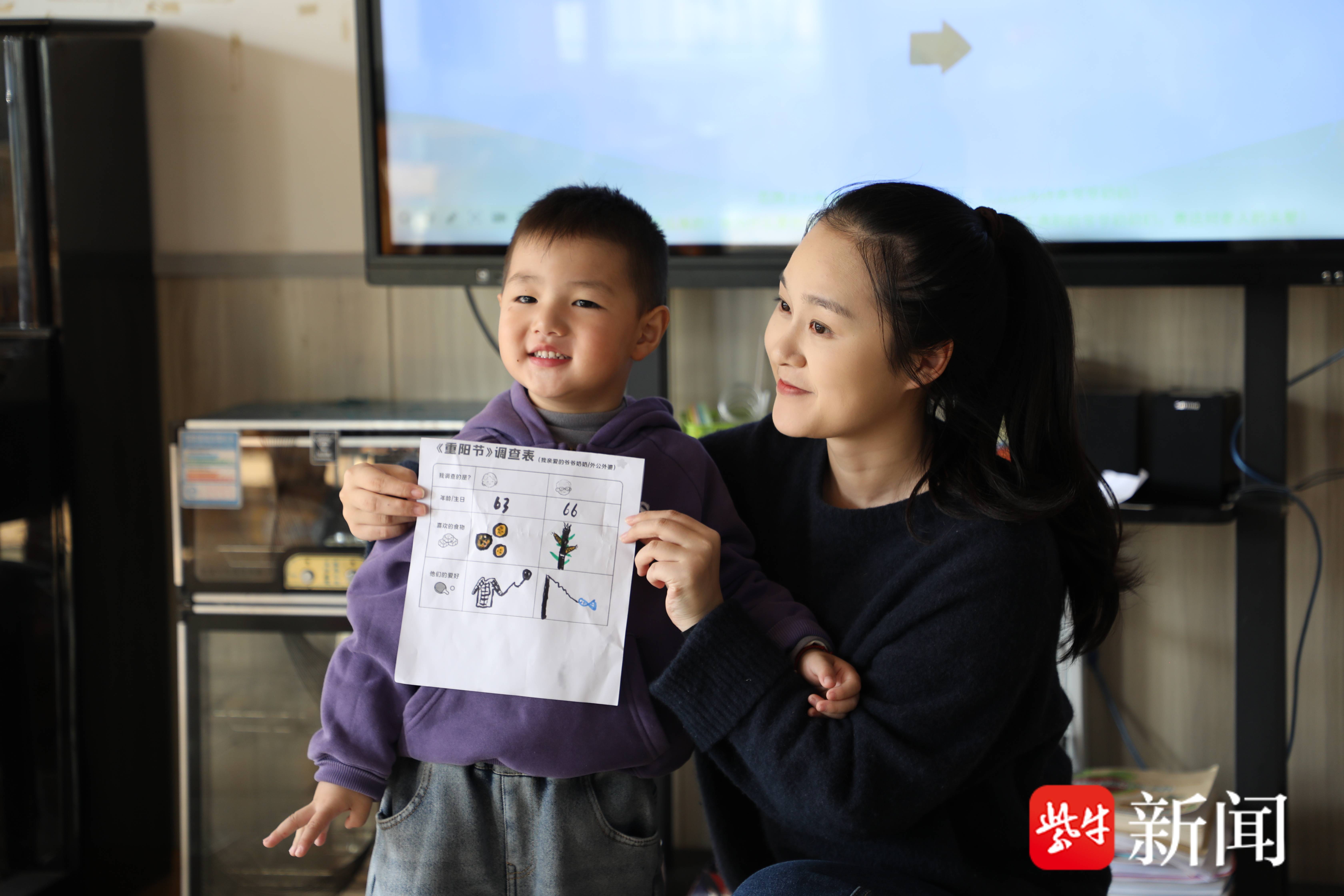 在小班教室,老师正通过《爷爷一定有办法》等绘本,引导孩子们回忆祖辈陪伴的温暖瞬间,再用“重阳知多少”问答游戏,将登高、赏菊等习俗融入趣味互动,孩子们举着小手踊跃抢答,眼神里满是好奇。“老师说,重阳节是爷爷奶奶的节日。我知道要陪奶奶去公园散步,就像奶奶平时陪我一样。”射阳县黄沙港镇实验幼儿园幼儿唐槿龄稚声稚气地说。