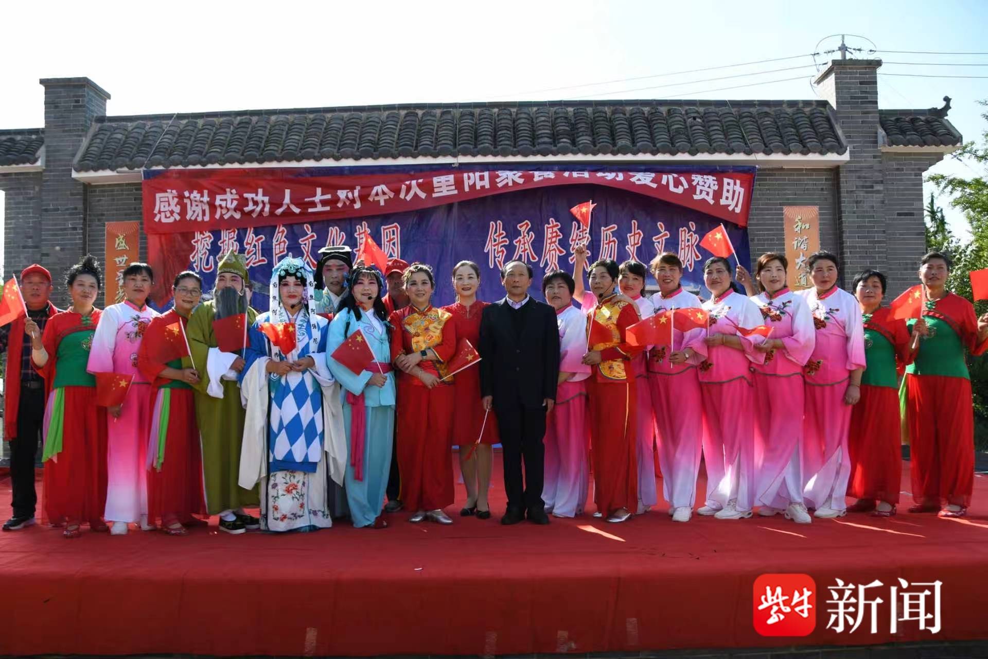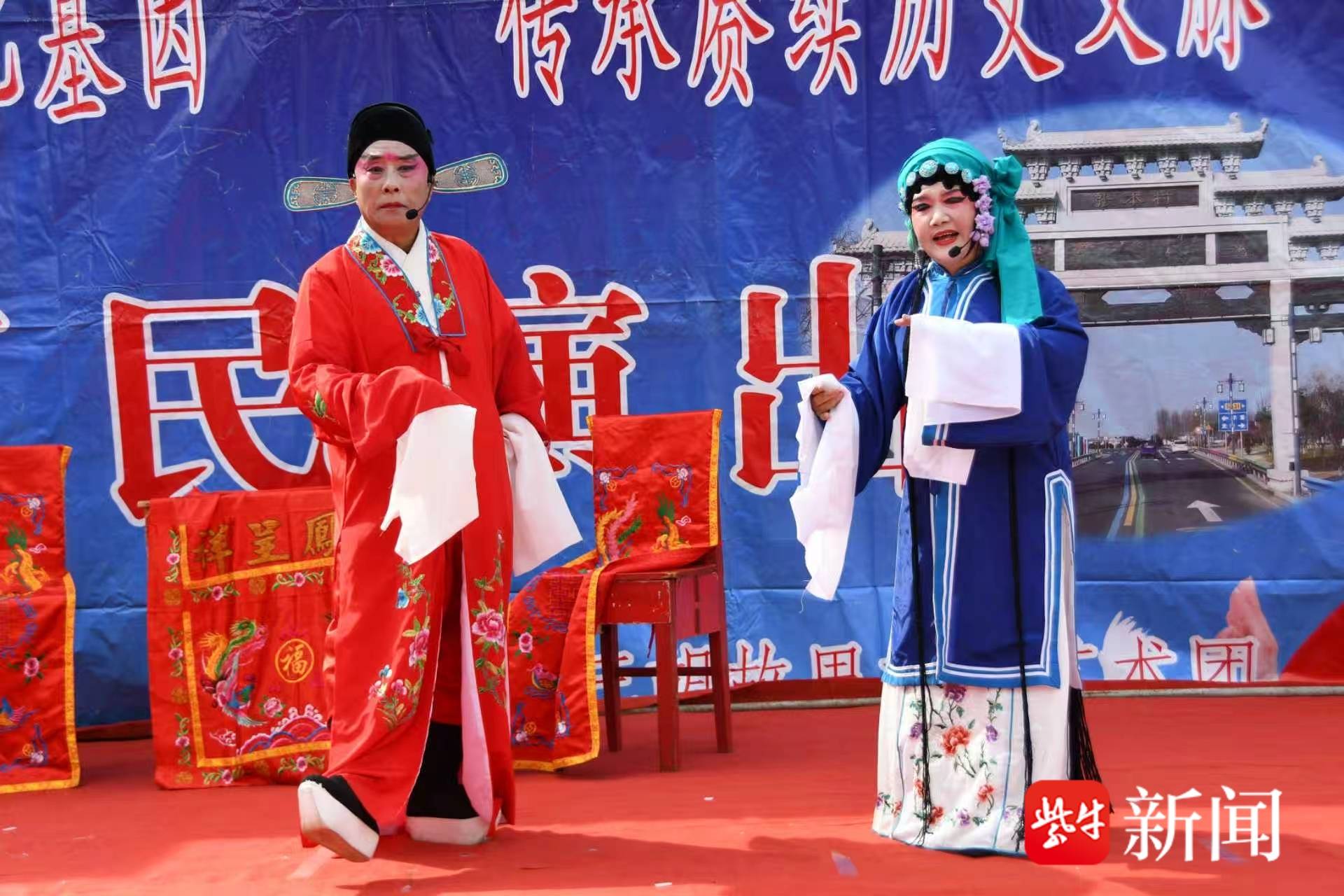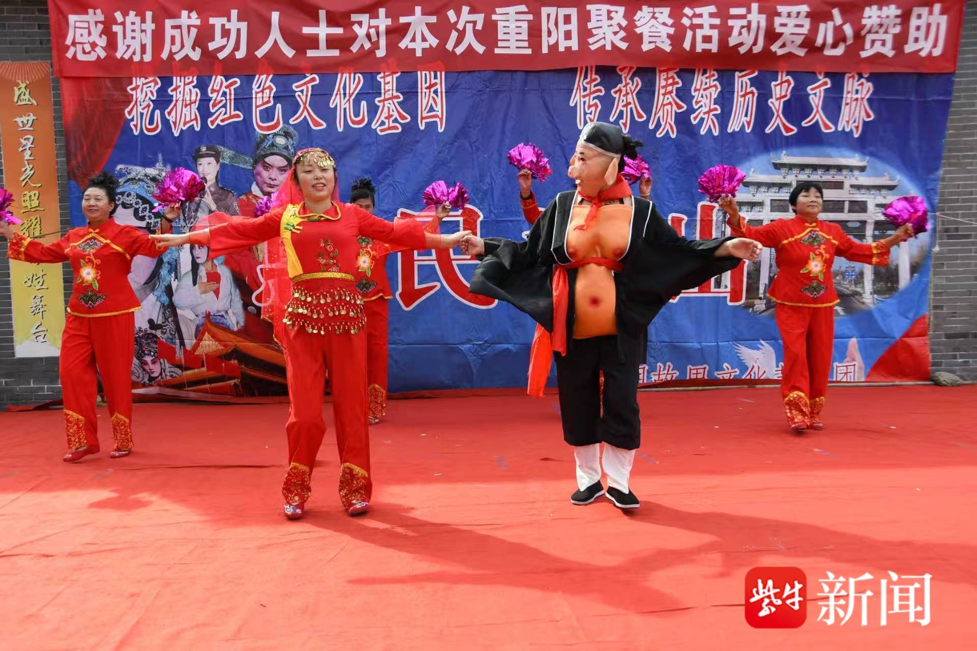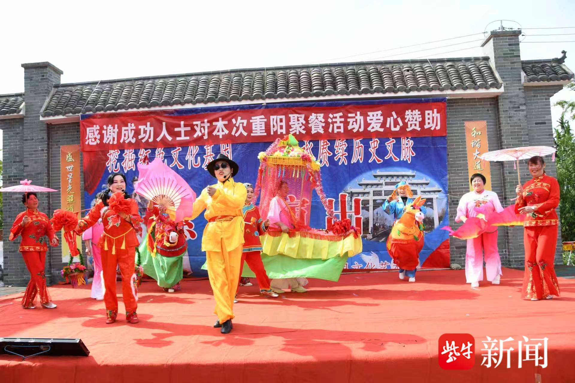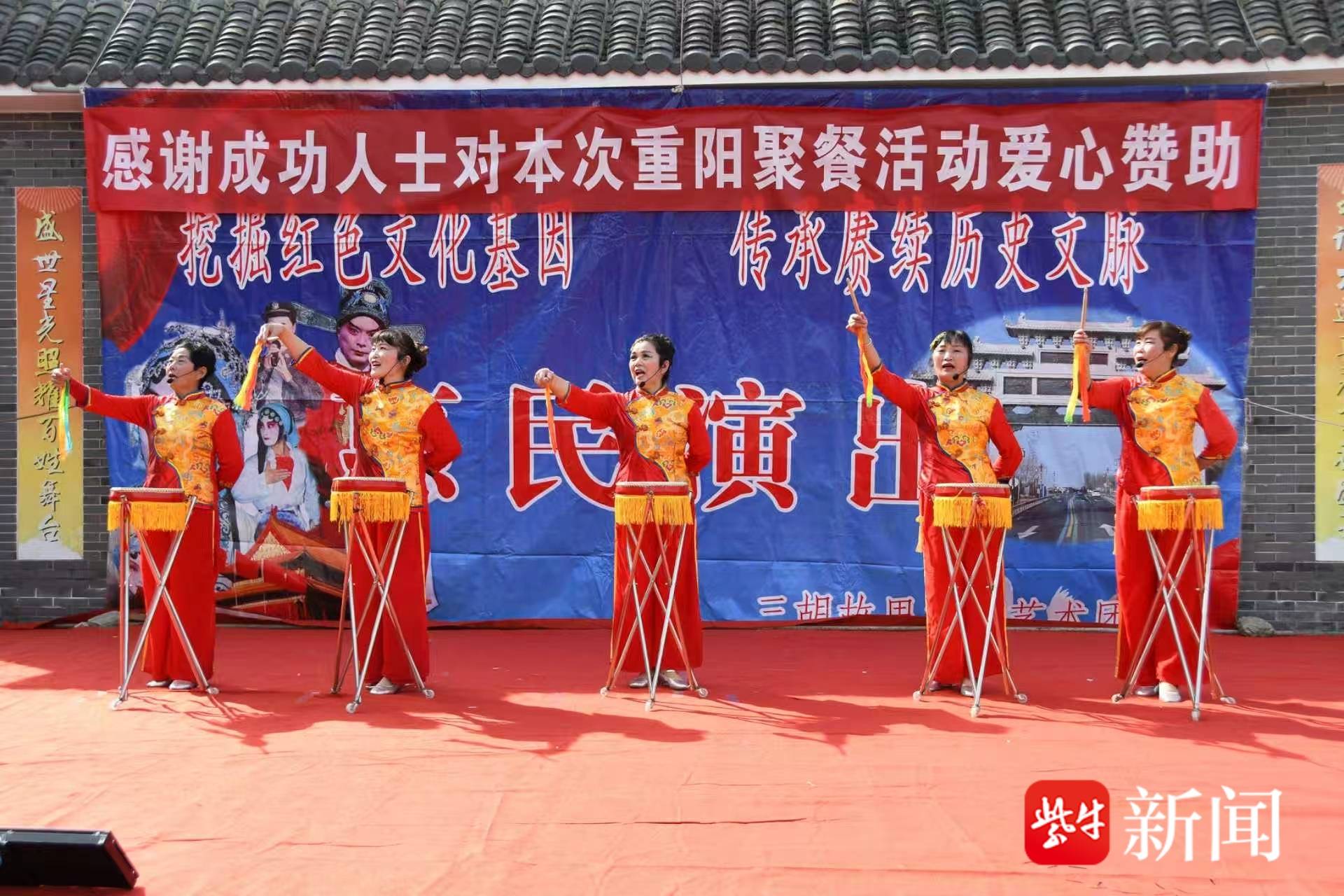 午餐期间,精彩的文艺演出在村文化广场拉开帷幕。由“三胡故里文化艺术团”带来的节目单内容丰富:表演唱《夸老板》热闹开场,淮剧《书房会》《探寒窑:窑外》《莲花庵》让戏迷过足瘾,打鼓说唱《三胡礼赞》、打莲箱《创造奇迹奔小康》充满乡土气息,舞蹈《拥军秧歌》《猪八戒娶媳妇》《十送红军》更是赢得老人们的阵阵喝彩,最后大合唱《没有共产党就没有共和国》将现场气氛推向高潮。老人们看得津津有味,时不时跟着旋律打节拍、哼上几句。