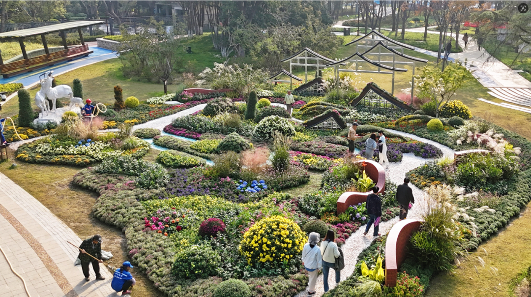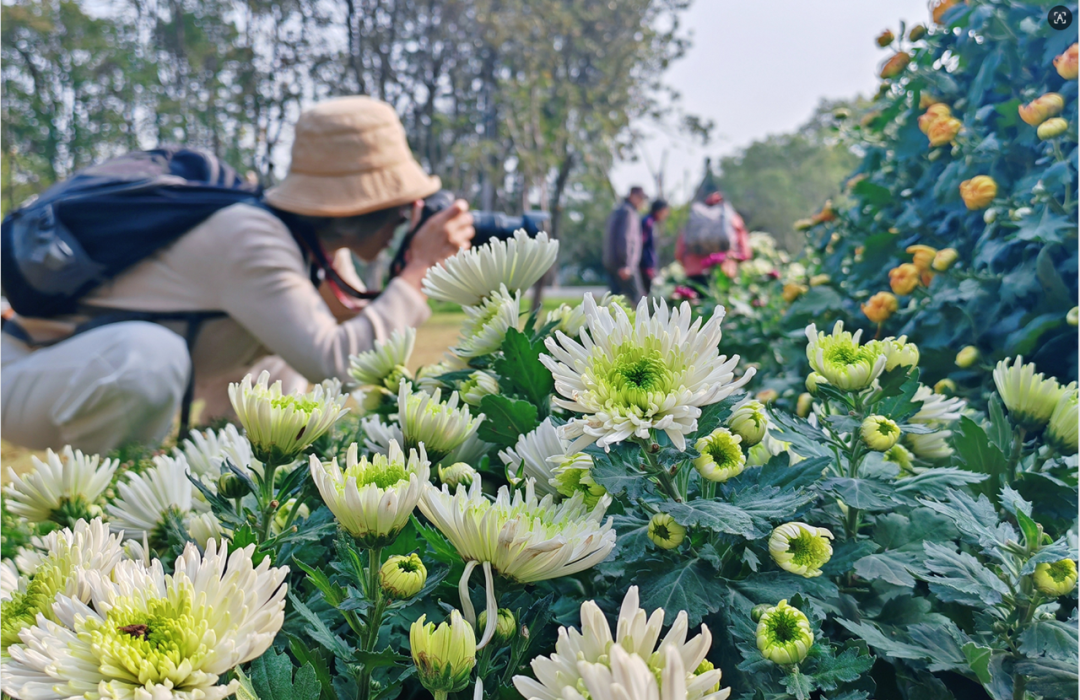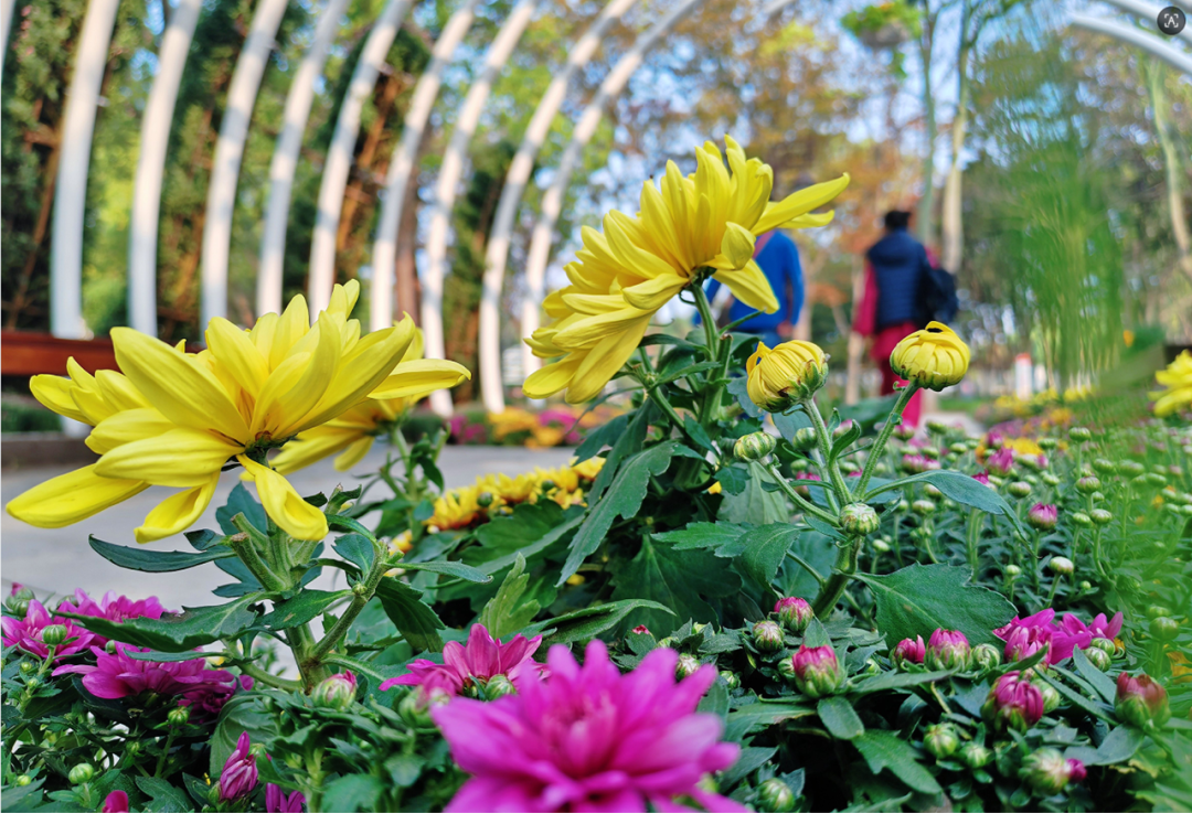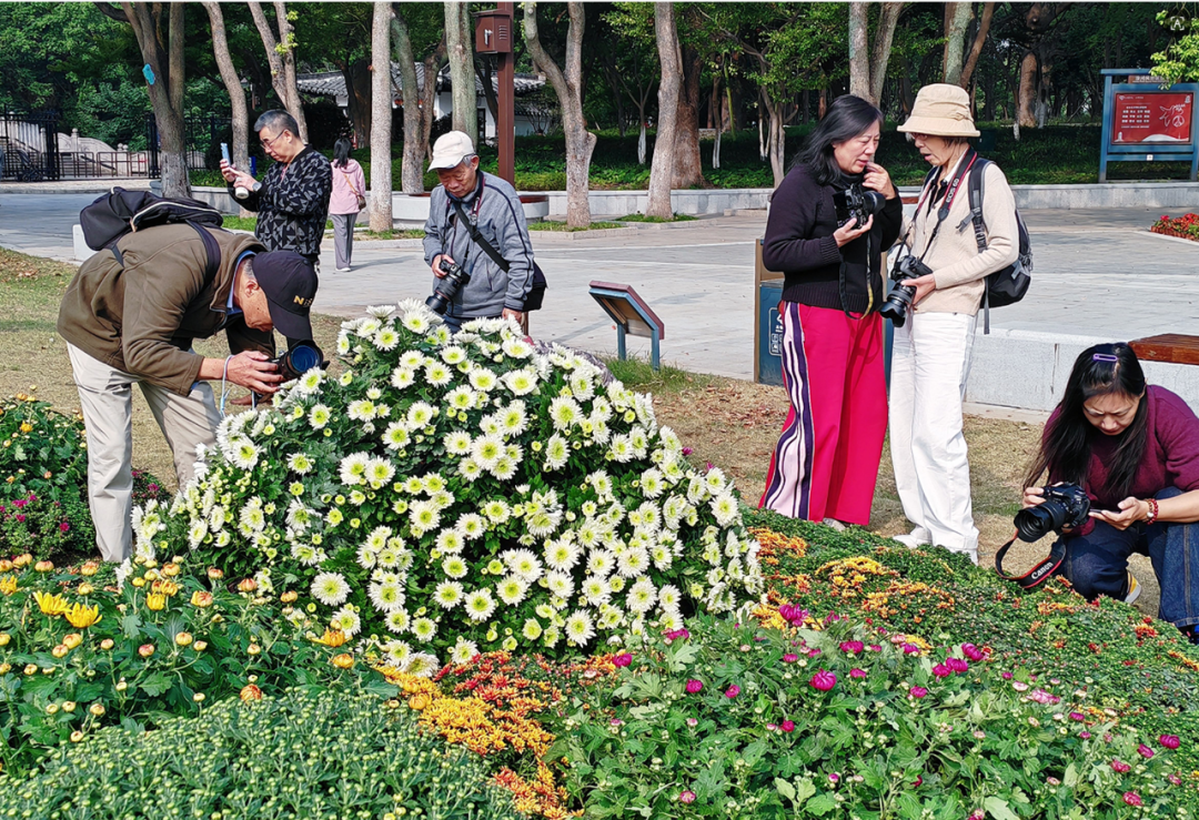 “走进花丛中,空气里都是菊香。” 在文峰公园北门菊艺景点,市民李兰举着手机与绽放的 “金缕流霞” 合影。作为本次赏菊活动的核心场地之一,文峰公园打破传统围栏式参观模式,在北门、西门草坪打造两处开放式菊艺空间,2.1万余盆菊花与假山、驳岸、亭廊相映成趣,形成层次丰富的“菊韵秋景”。