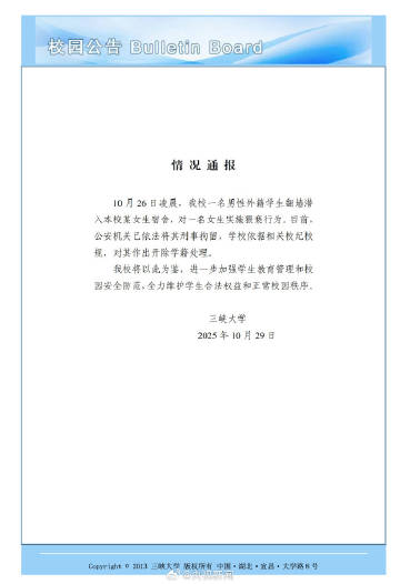 10月26日凌晨,三峡大学一名男性外籍学生翻墙潜入某女生宿舍,对一名女生实施猥亵行为。