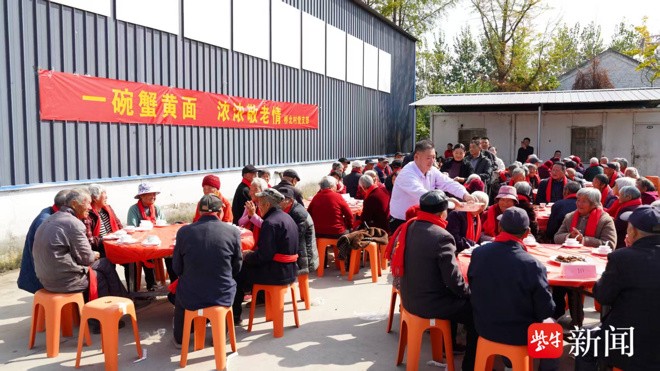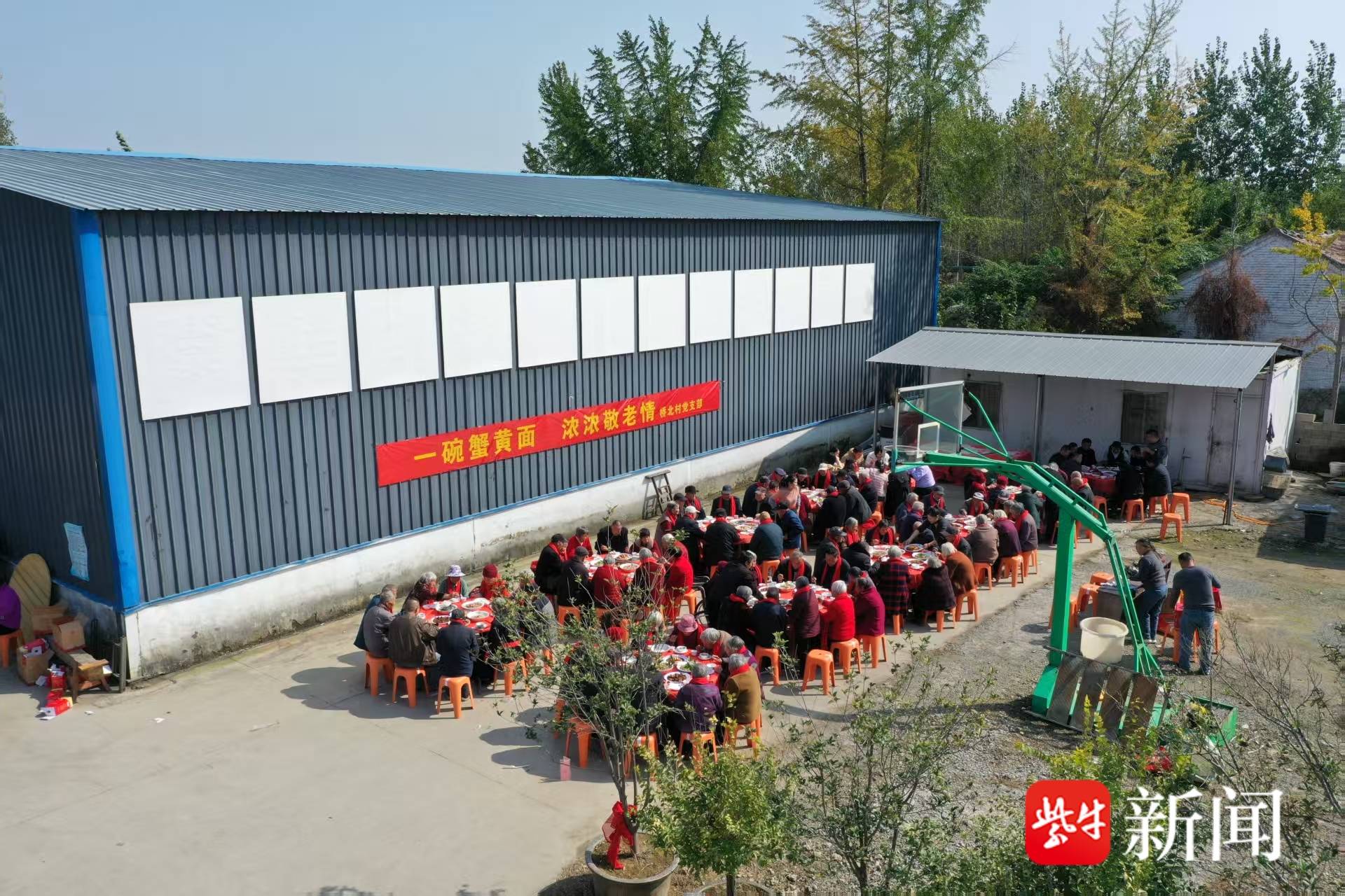 10月28日上午,在宿迁侨北渔业发展有限公司院内暖意融融,一场以“桥北‘蟹’谢你 家乡会更美”为主题的重阳节欢庆活动正在举行,全村80位80岁以上的老人参加了活动。
