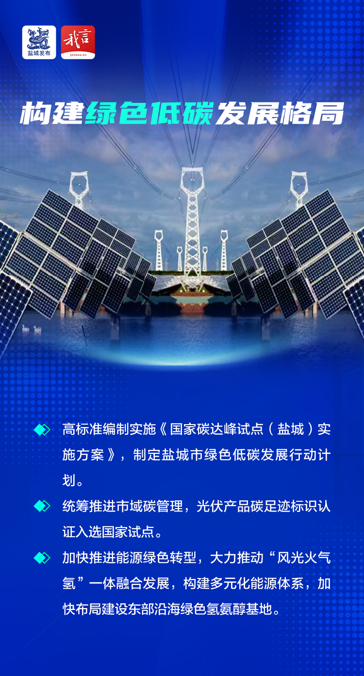 绿色低碳发展绘就“新画卷”。高标准编制实施《国家碳达峰试点(盐城)实施方案》,制定盐城市绿色低碳发展行动计划,一体推进国家碳达峰试点城市和省绿色低碳发展示范区建设。坚持“五化”并进推进零碳园区建设,积极探索绿电“+氢能”“+新型电力系统”“+冷能”等多种路径,大丰、射阳、滨海三大零碳园区全部实现可溯源绿电接入。统筹推进市域碳管理,光伏产品碳足迹标识认证入选国家试点。加快推进能源绿色转型,大力推动“风光火气氢”一体融合发展,构建多元化能源体系,加快布局建设东部沿海绿色氢氨醇基地。