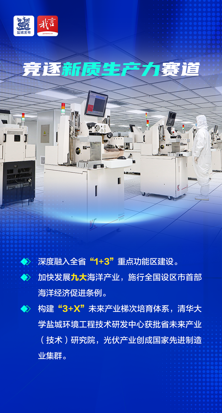 新质生产力培育按下“快进键”。深度融入全省“1+3”重点功能区建设,以培育沿海重要增长极、打造新质生产力重要阵地为目标,坚定不移向海逐蓝、向新而行。深化海洋经济管理体制机制改革,加快发展九大海洋产业,施行全国设区市首部海洋经济促进条例。深入实施加快培育发展未来产业三年行动计划,构建“3+X”未来产业梯次培育体系,积极布局“人工智能”“低空经济”等新赛道,清华大学盐城环境工程技术研发中心获批省未来产业(技术)研究院,光伏产业创成国家先进制造业集群。