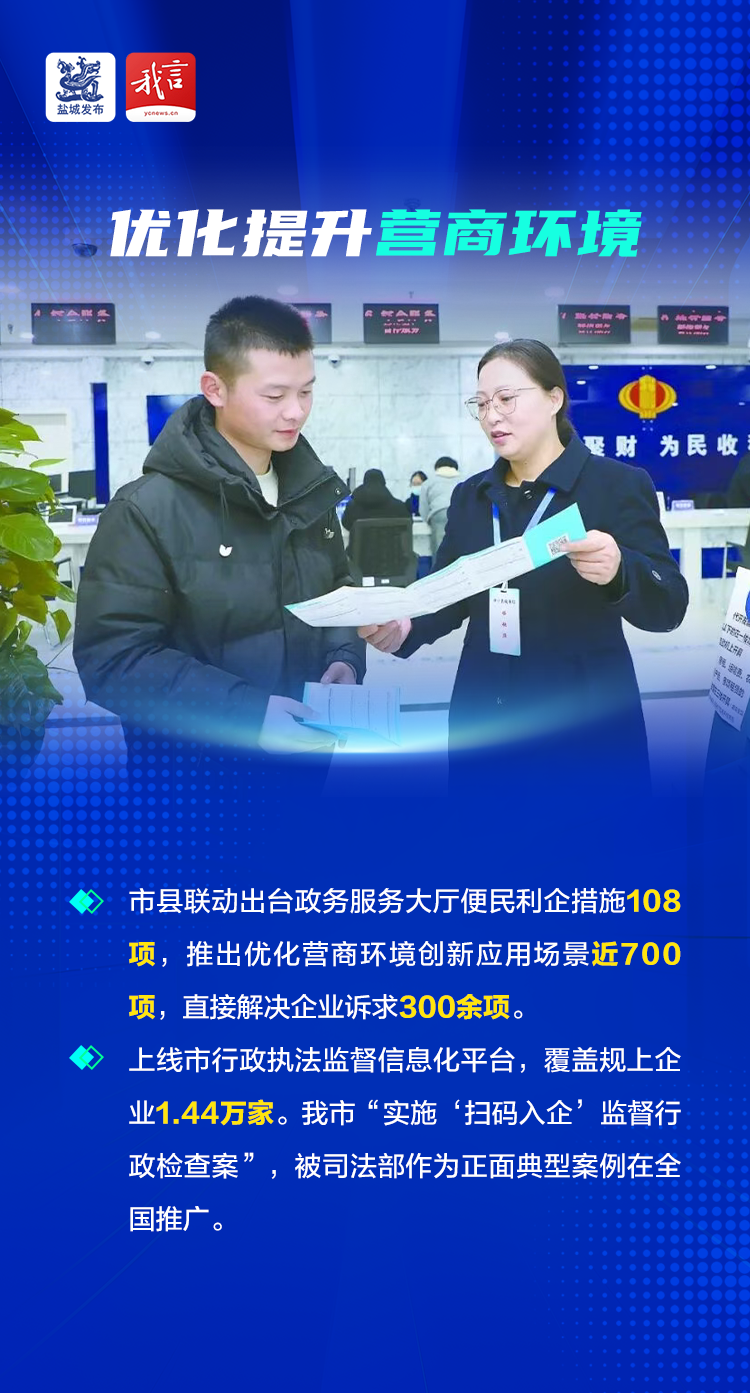 近年来,盐城在全市范围内开展“一把手走流程、查实情、送政策、抓环境”四项工作和优化营商环境“十百千”行动,所有涉企服务部门印发对标先进地区优化营商环境十项举措清单,市县联动出台政务服务大厅便民利企措施108项,推出优化营商环境创新应用场景近700项,直接解决企业诉求300余项。