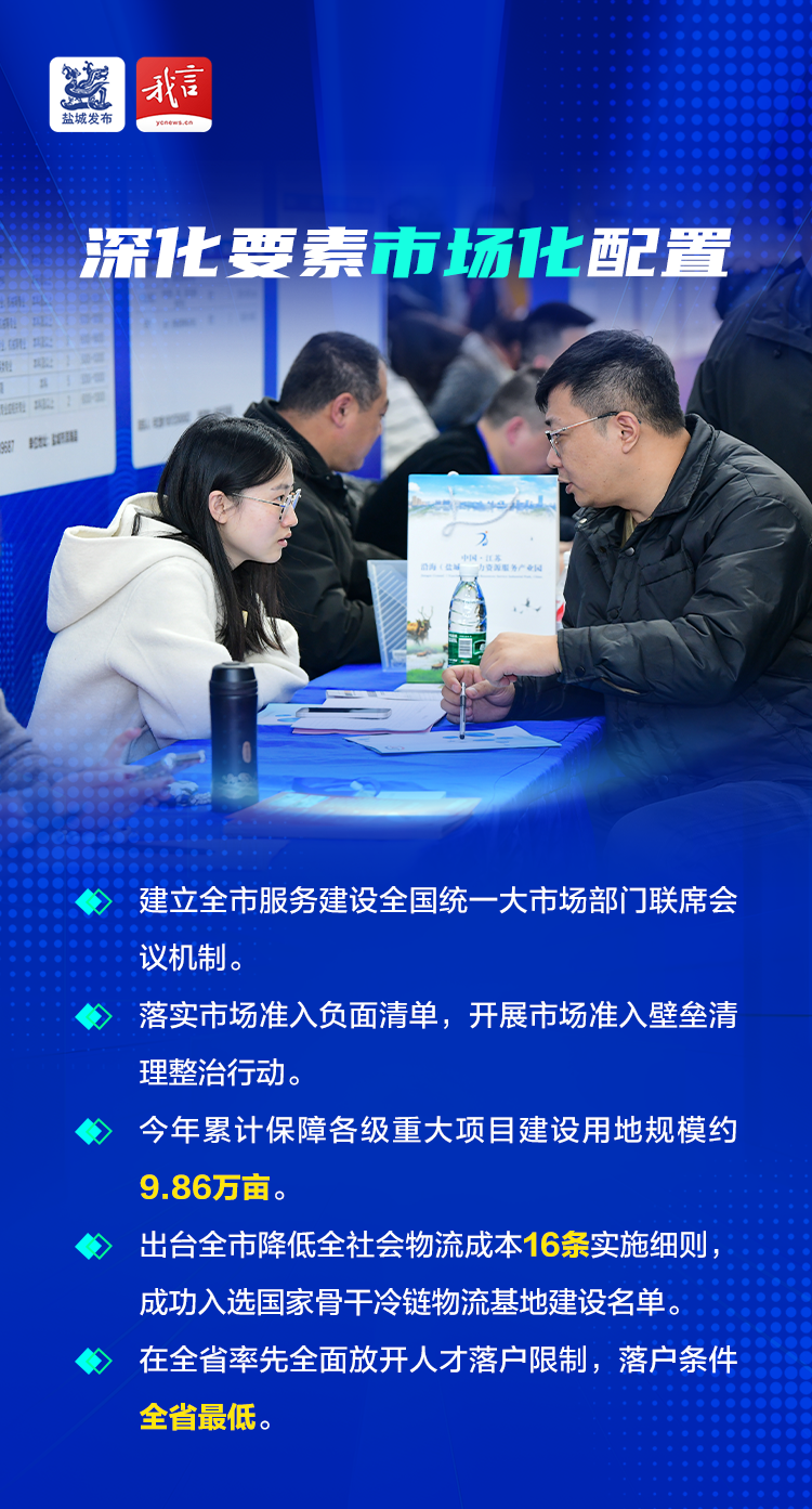 要素配置改革跑出“加速度”。建立全市服务建设全国统一大市场部门联席会议机制,以清单化、项目化推进服务全国统一大市场建设。落实市场准入负面清单,开展市场准入壁垒清理整治行动,实行重大政策措施公平竞争会同审查。完善项目签约、开工、竣工、达产全生命周期管理机制,全方位保障项目有序推进,今年累计保障各级重大项目建设用地规模约9.86万亩。出台全市降低全社会物流成本16条实施细则,成功入选国家骨干冷链物流基地建设名单。在全省率先全面放开人才落户限制,让人才“引得进、留得住、用得好”。