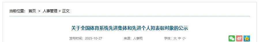 根据全国体育系统先进集体和先进个人评选表彰工作安排,经逐级推荐和评选,全国体育系统先进集体和先进个人评选表彰工作领导小组审核,拟表彰全国体育系统先进集体67个、先进个人162名。为充分发扬民主,广泛听取意见,接受社会监督,现将拟表彰对象予以公示。公示期为2025年10月28日至2025年11月3日。
