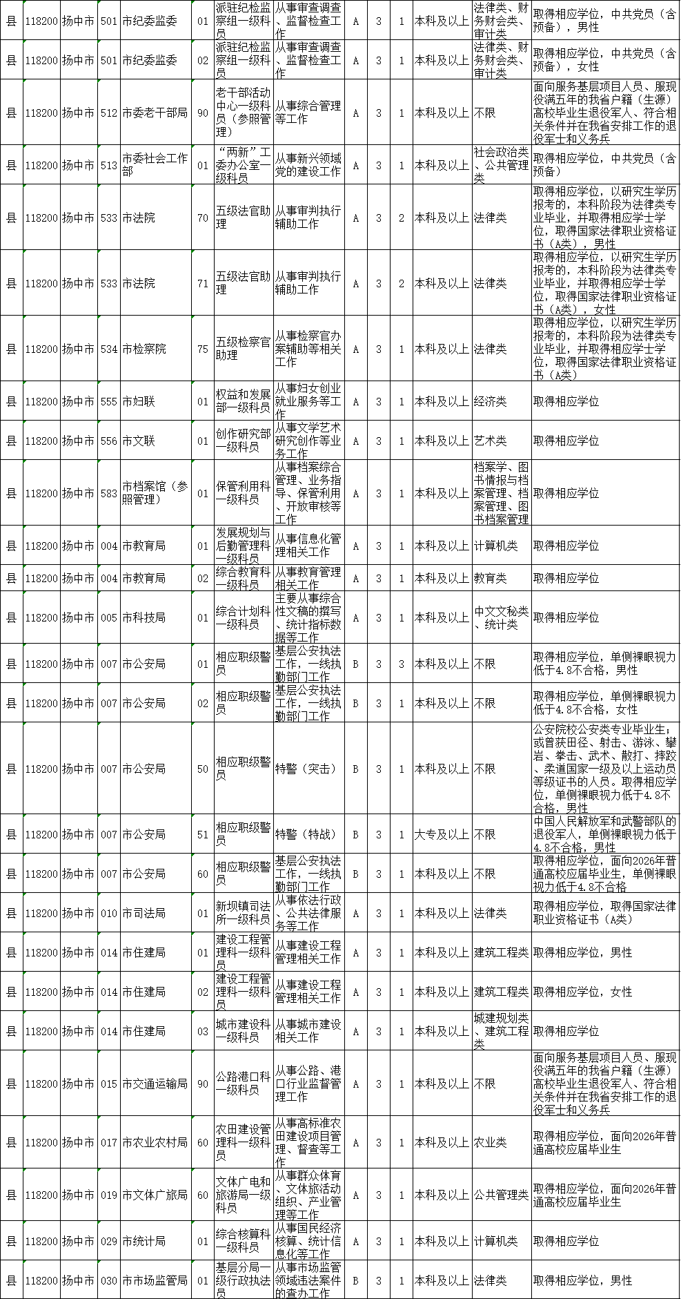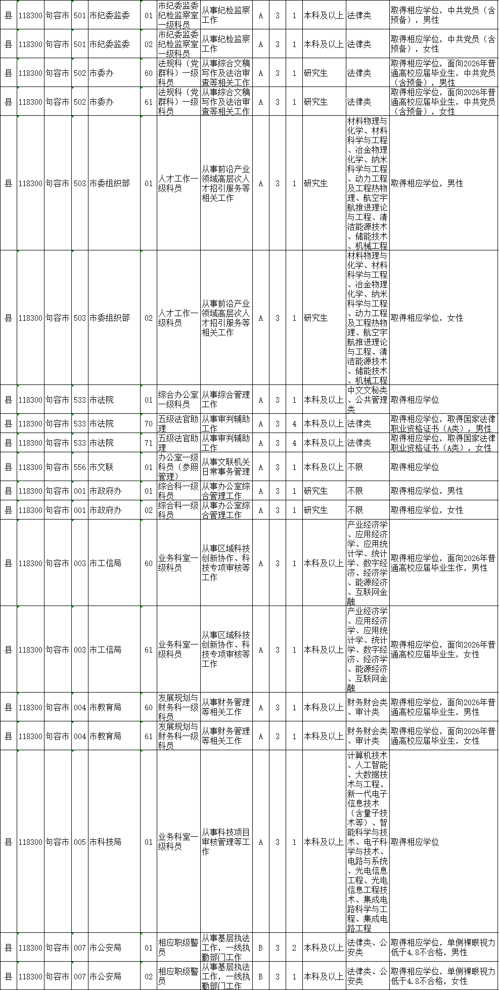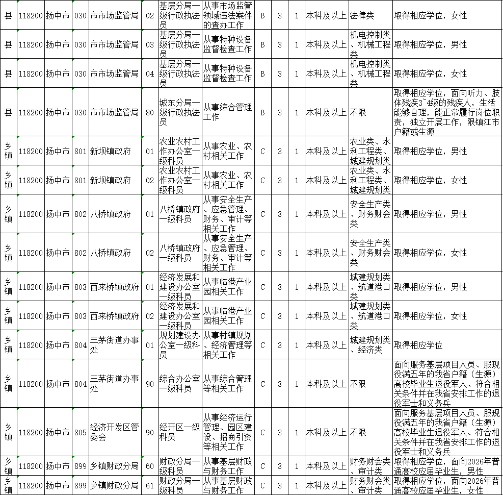 4.面向2026年普通高校应届毕业生招录的职位(职位代码60-69),招录对象为:2026年普通高校应届毕业生;经我省项目管理办公室选拔派遣,报名前服务期满且考核合格2年内的“西部计划”、“三支一扶”计划、“志愿服务乡村振兴计划”(含原“苏北计划”)志愿者,以及外省选派的江苏生源“西部计划”志愿者;2024年9月1日至报名前取得国(境)外学位并完成教育部留学服务中心学历认证的留学回国人员;从国家统一招生的普通高校毕业并在当年入伍,且于2024年9月1日至报名前从中国人民解放军或者中国人民武装警察部队退役的军人。上述人员中,具有研究生学历并取得相应学位的报考者不受生源地限制,其他报考者须为江苏生源。