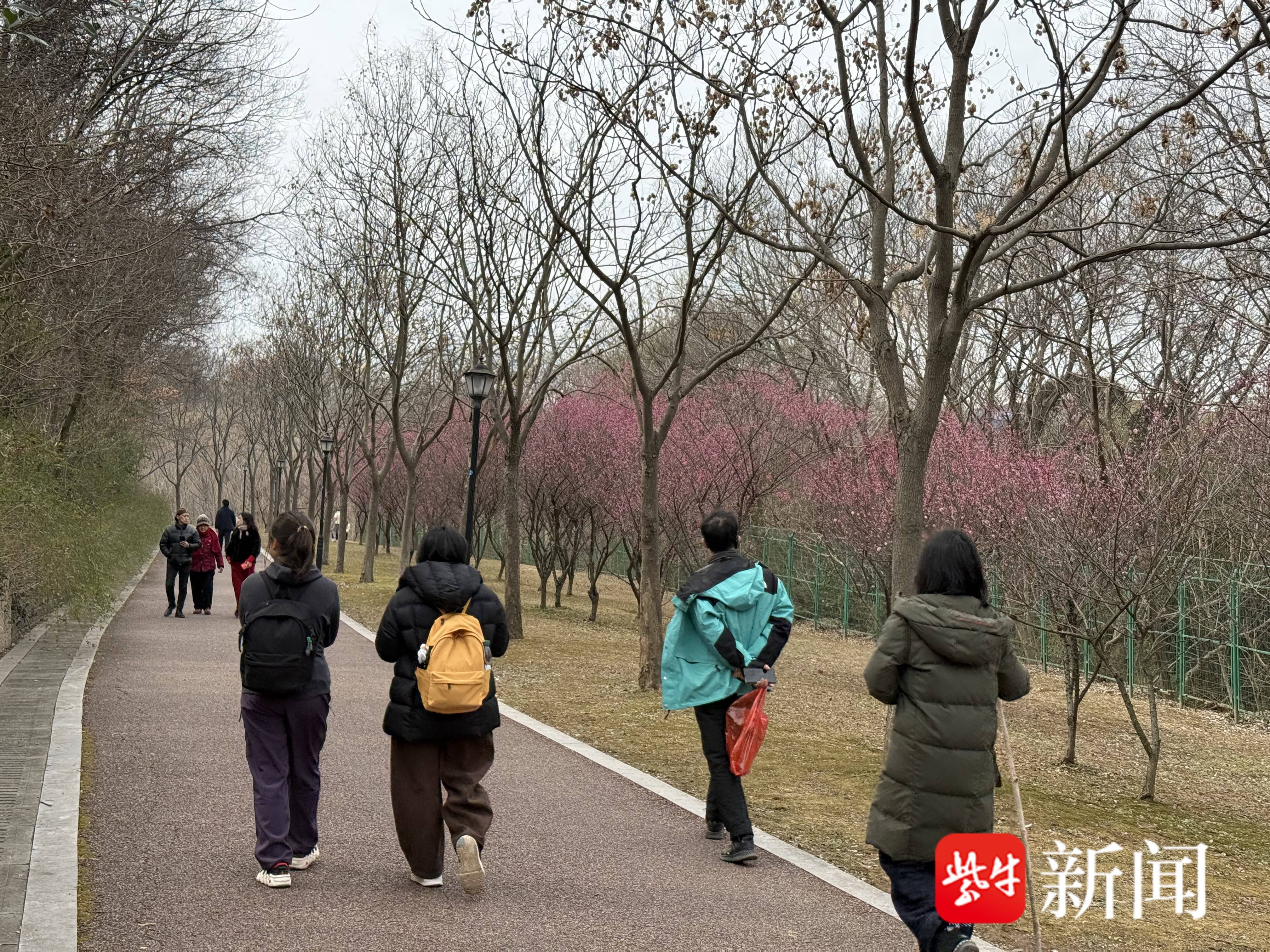 沿着绿道一路前行,成片梅林次第绽放,或含苞待放,或迎风盛开。微风拂过,花瓣轻颤,空气中弥漫着清雅花香。上午时分,不少市民携家带口前来散步游玩,有人举起手机定格花影,有人放慢脚步细细观赏。