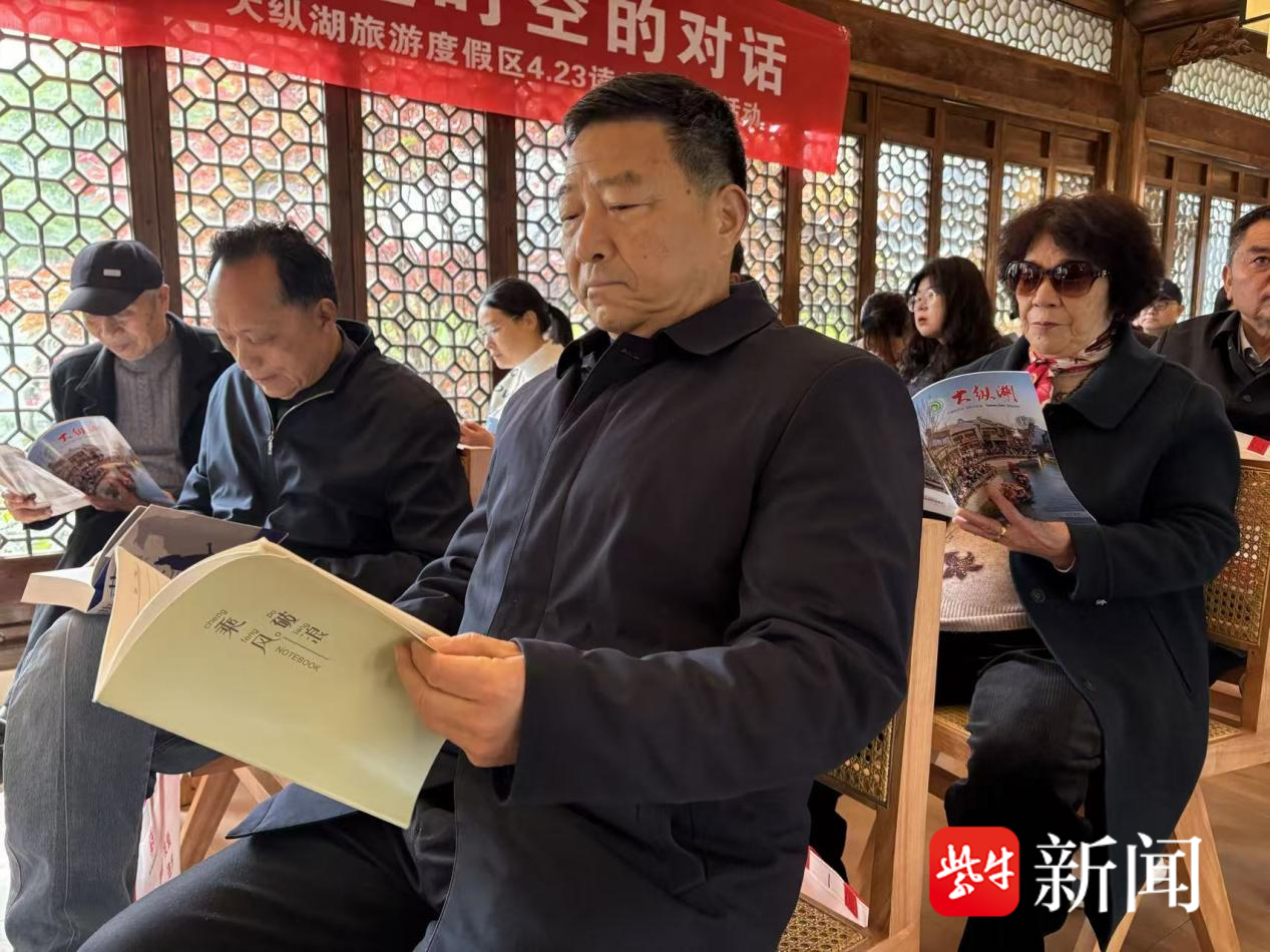在第 31个世界读书日来临之际,4月23日上午,盐城大纵湖旅游度假区宣传办联合文旅办、工会、妇联、团工委、网格办、老龄委等多部门,于大纵湖景区板桥书院开展了“书香润湖光·穿越时空的对话”主题沉浸式读书活动。阅读爱好者与游客齐聚一堂,共赴春日书香之约,在湖光文脉间品读经典。