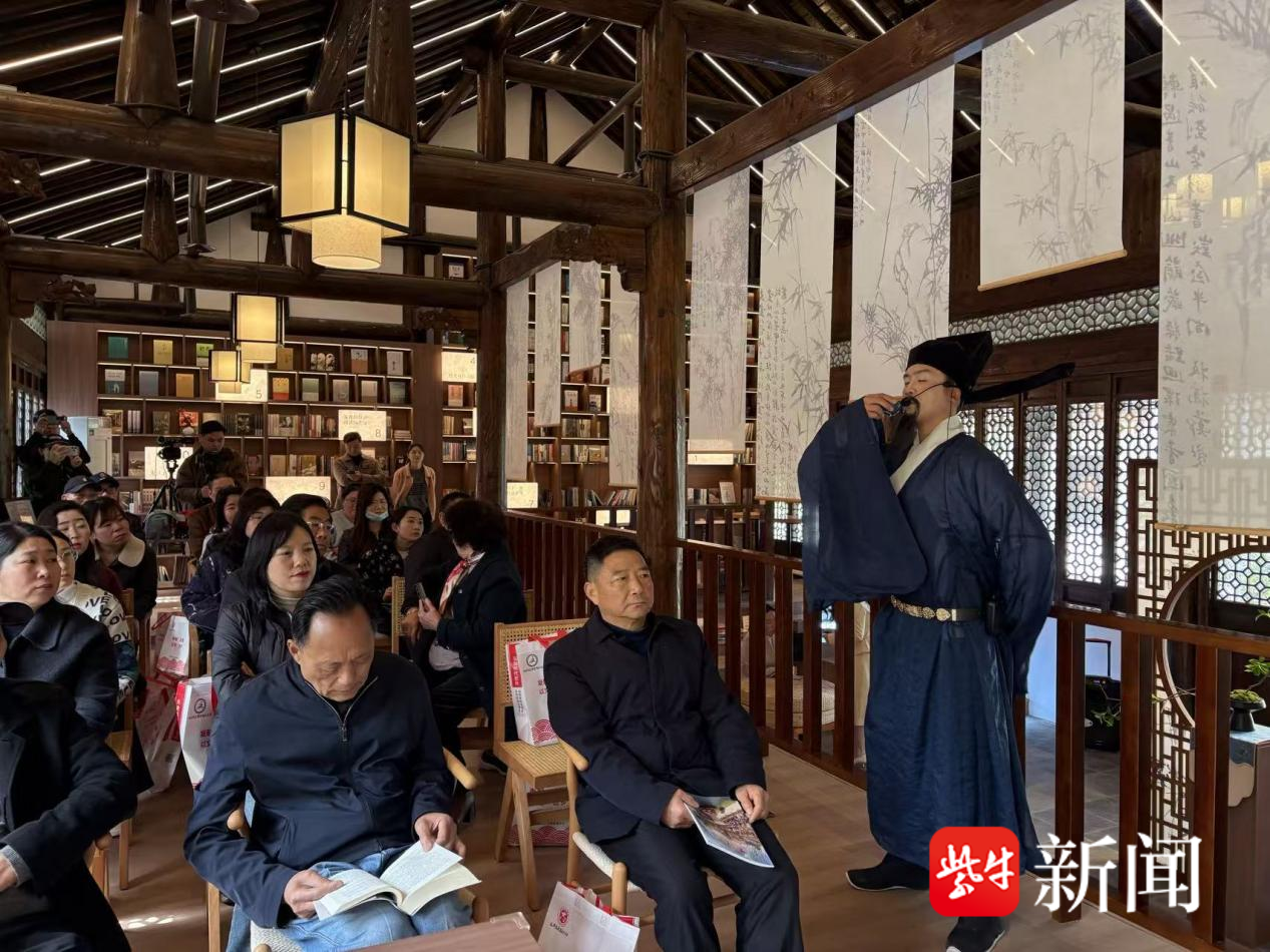 活动核心环节——“穿越时空的对话”沉浸式表演,成为整场活动的一大亮点。扬州八怪之一、曾在大纵湖畔开馆执教的郑板桥身着古朴长衫缓步登台。他临窗而立,望着窗外青竹掩映、假山错落的景致,一时诗兴勃发,朗声吟诵起自己在大纵湖畔写下的《青松歌》:“乱劈青松欲作柴,古根铁干不能灰。又从雪压霜欺后,竞长虬枝碧叶来。” 深情的诵读声落,台下顿时响起阵阵热烈的掌声。兴致正浓的他,又现场与读者以古人赞美大纵湖的诗句互动对诗。问:“平湖一色千顷秋”?答:“湖光渺渺水长流”。问:“扁舟一棹泛秋波”?答:“月色平铺似画图”。一来一往,氛围十分热烈。