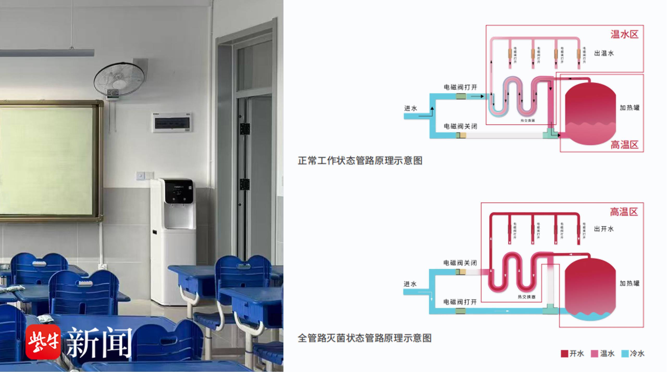 饮水安全是校园食安的重要组成部分,也是保障师生健康的基础。沁尔康专注净水20年,秉持"汲水中好水,护饮水健康"的初心,积极履行社会责任。本次捐赠的是沁尔康独创的温开水进教室方案——净化主机安装在设备间,净化水通过专用管路输送到每个教室的管线机,学生不出教室就能喝上净饮水。